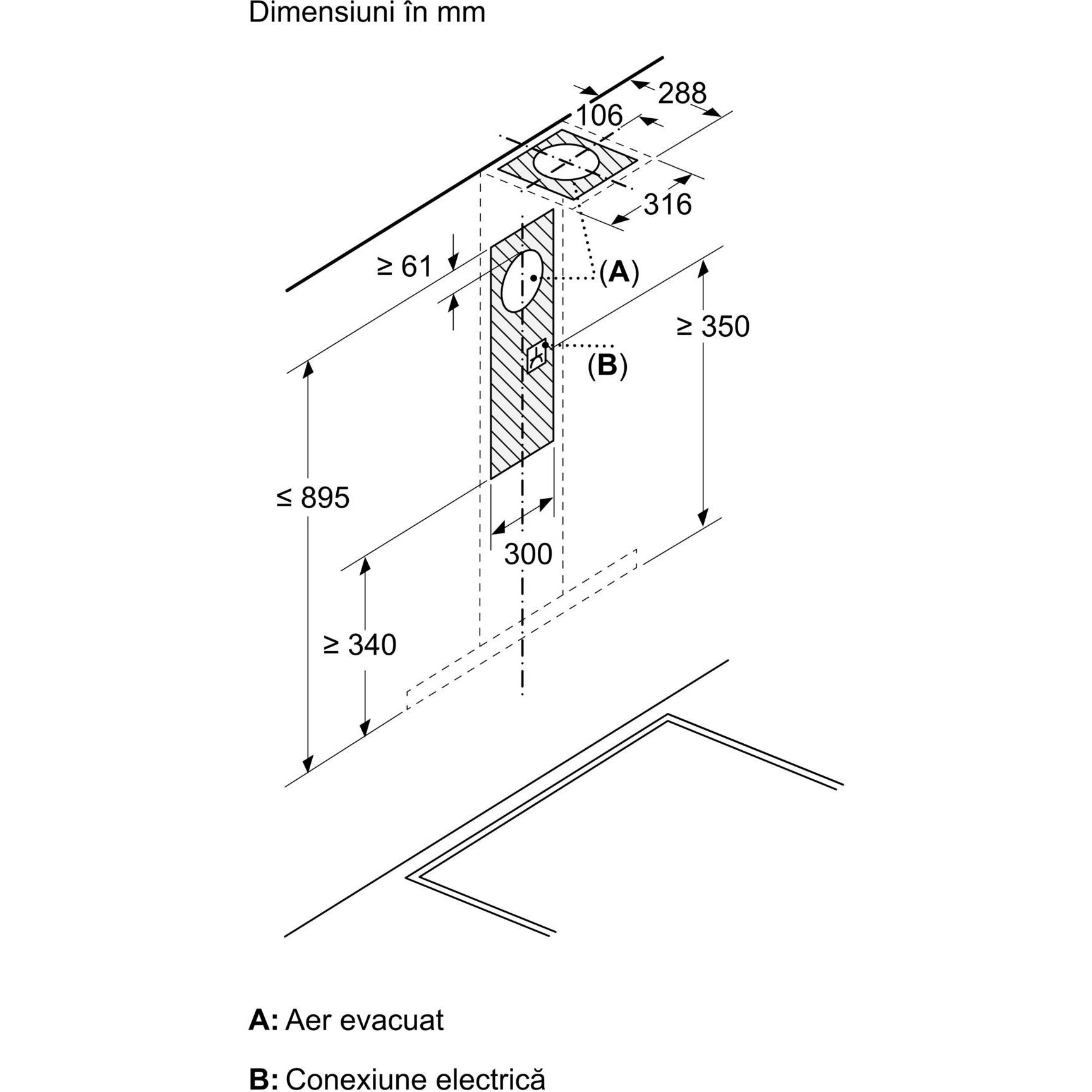 - Dimensiuni pentru montaj n mod evacuare (ÎxLxA): 635-895 x 598 x 500 mm