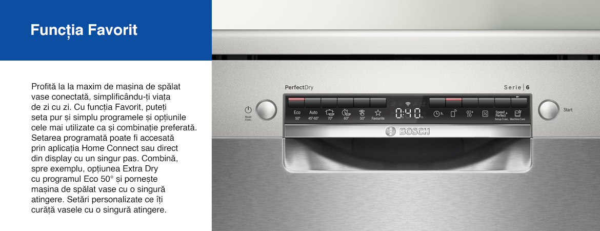 Profită la la maxim de mașina de spălat vase conectată, simplificându-ți viața de zi cu zi. Cu funcția Favorit, puteți seta pur și simplu programele și opțiunile cele mai utilizate ca și combinație preferată. Setarea programată poate fi accesată prin aplicația Home Connect sau direct din display cu un singur pas. Combină, spre exemplu, opțiunea Extra Dry cu programul Eco 50° și pornește mașina de spălat vase cu o singură atingere. Setări personalizate ce îți curăță vasele cu o singură atingere.