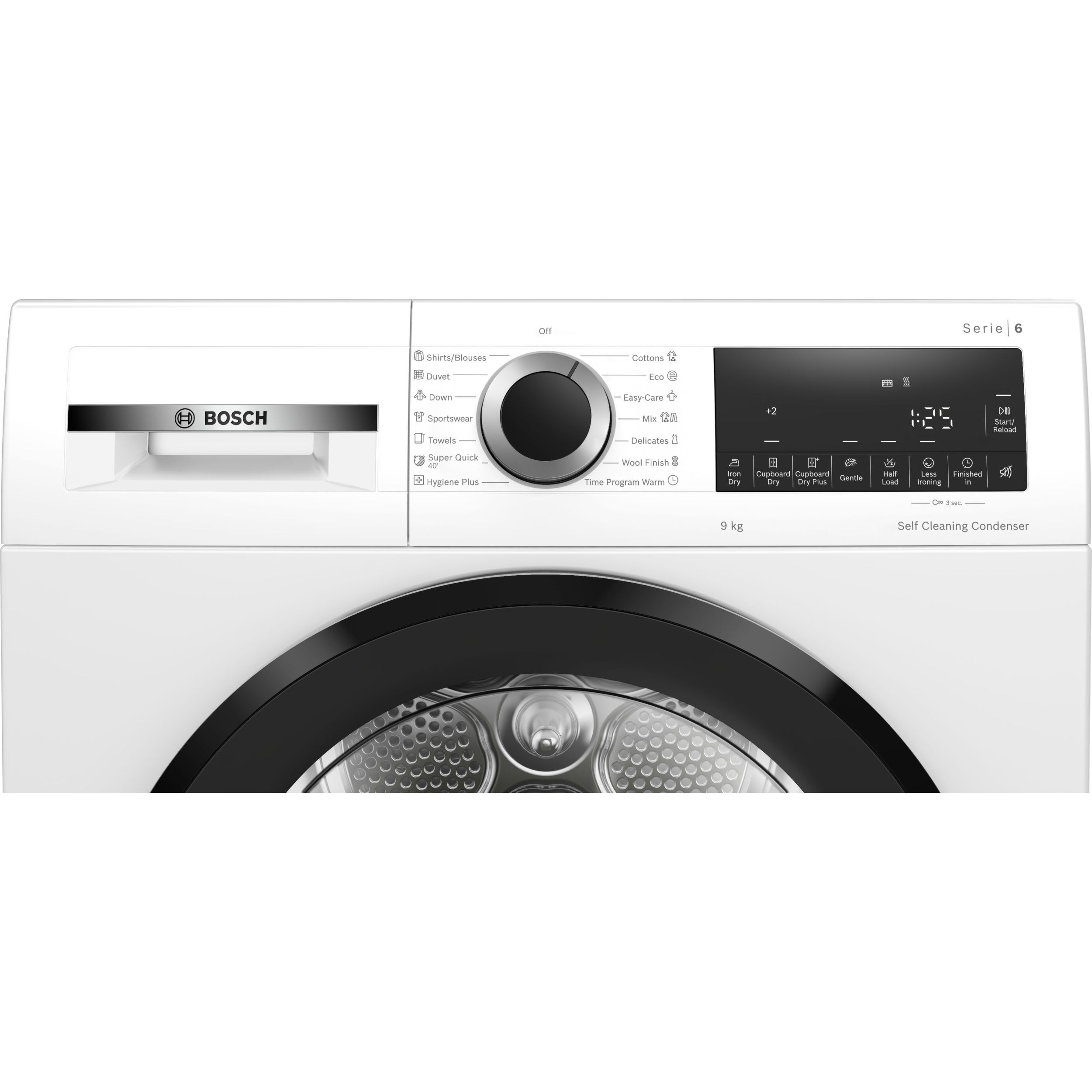 Programe speciale: Bumbac, Bluze/Cămăşi, Bumbac Eco, Ţesături închise la culoare, Delicate, Prosoape, Hygiene, Mix, Super 40 (Uscare rapida), Articole Sport, Pilote, Sintetice, Afânare lână (fără uscare), Program temporizat - aer cald