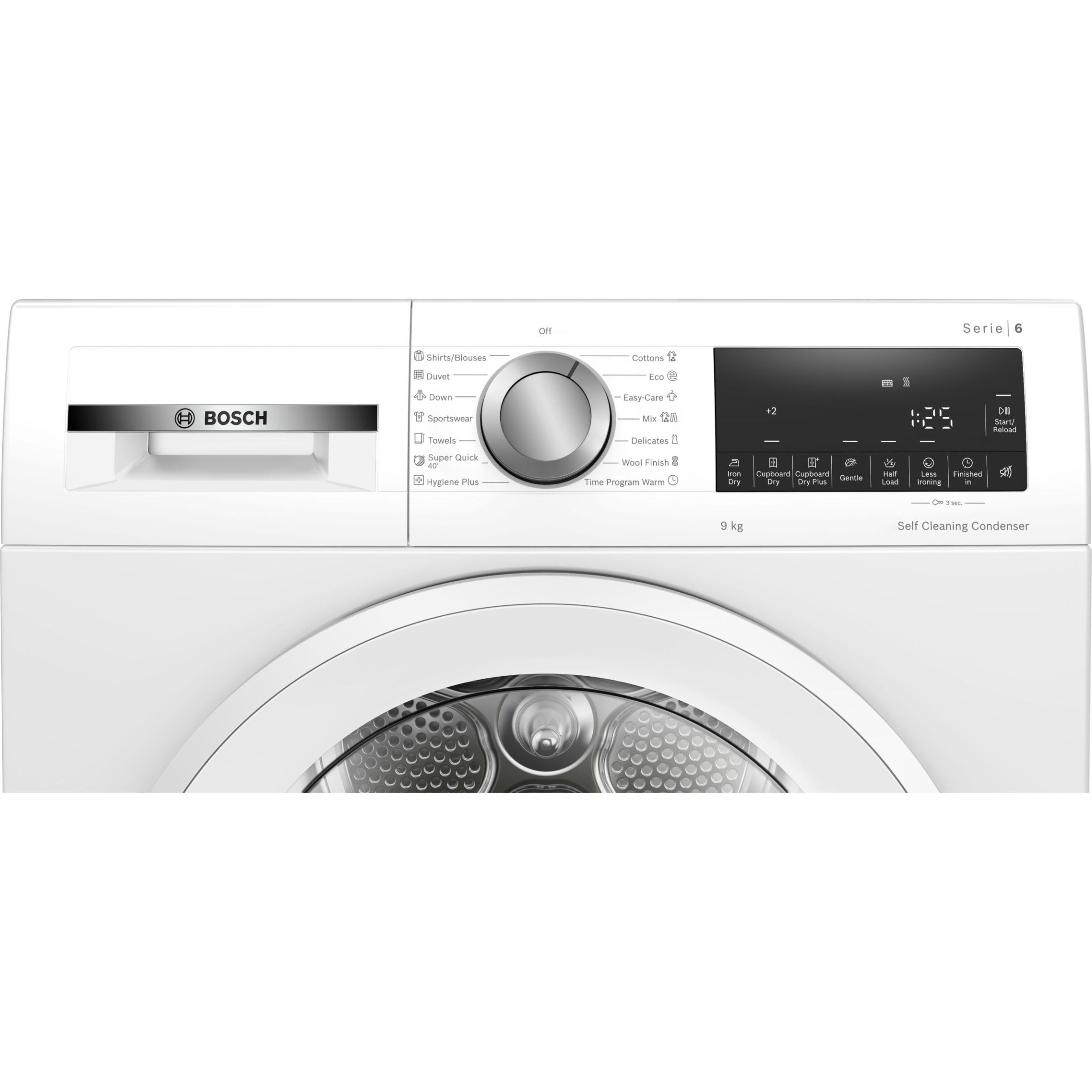 Programe speciale: Bumbac, Bluze/Cămăşi, Bumbac Eco, Ţesături închise la culoare, Delicate, Prosoape, Hygiene, Mix, Super 40 (Uscare rapida), Articole Sport, Pilote, Sintetice, Afânare lână (fără uscare), Program temporizat - aer cald