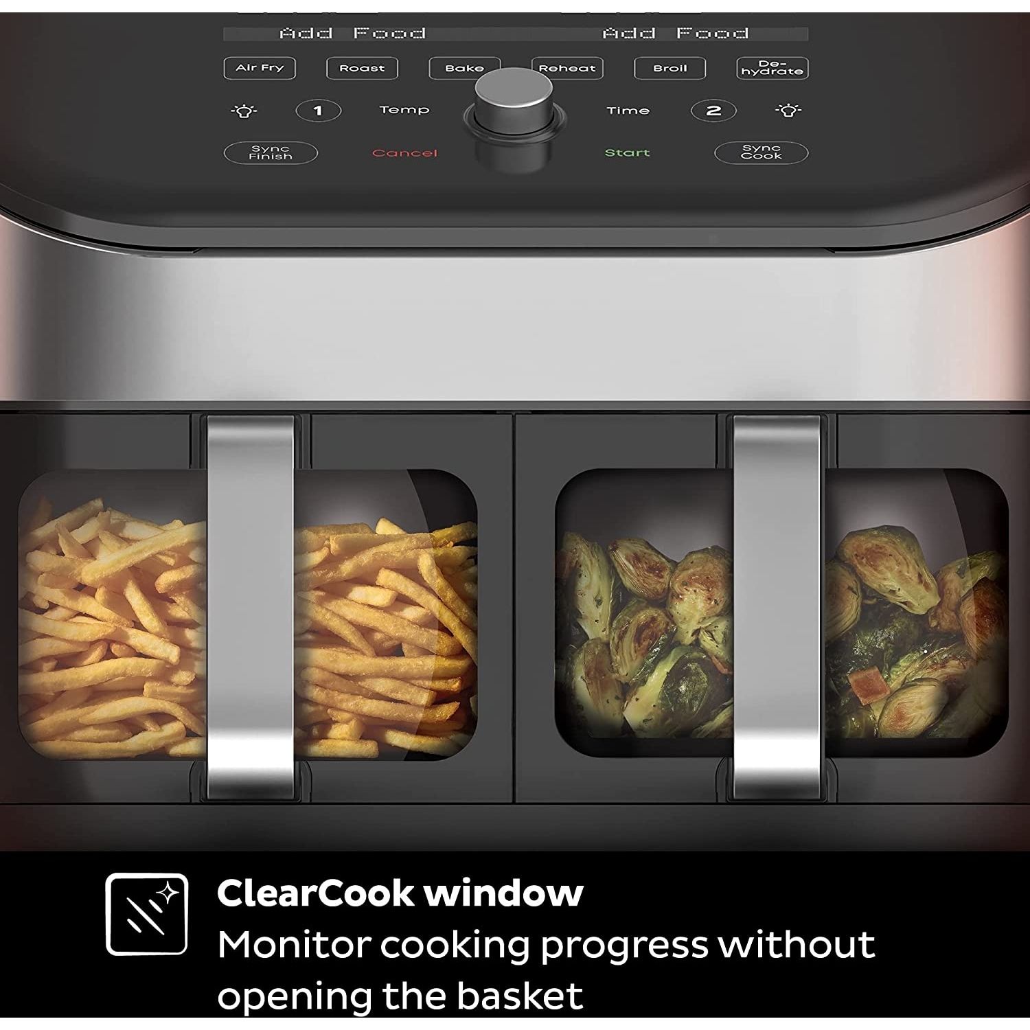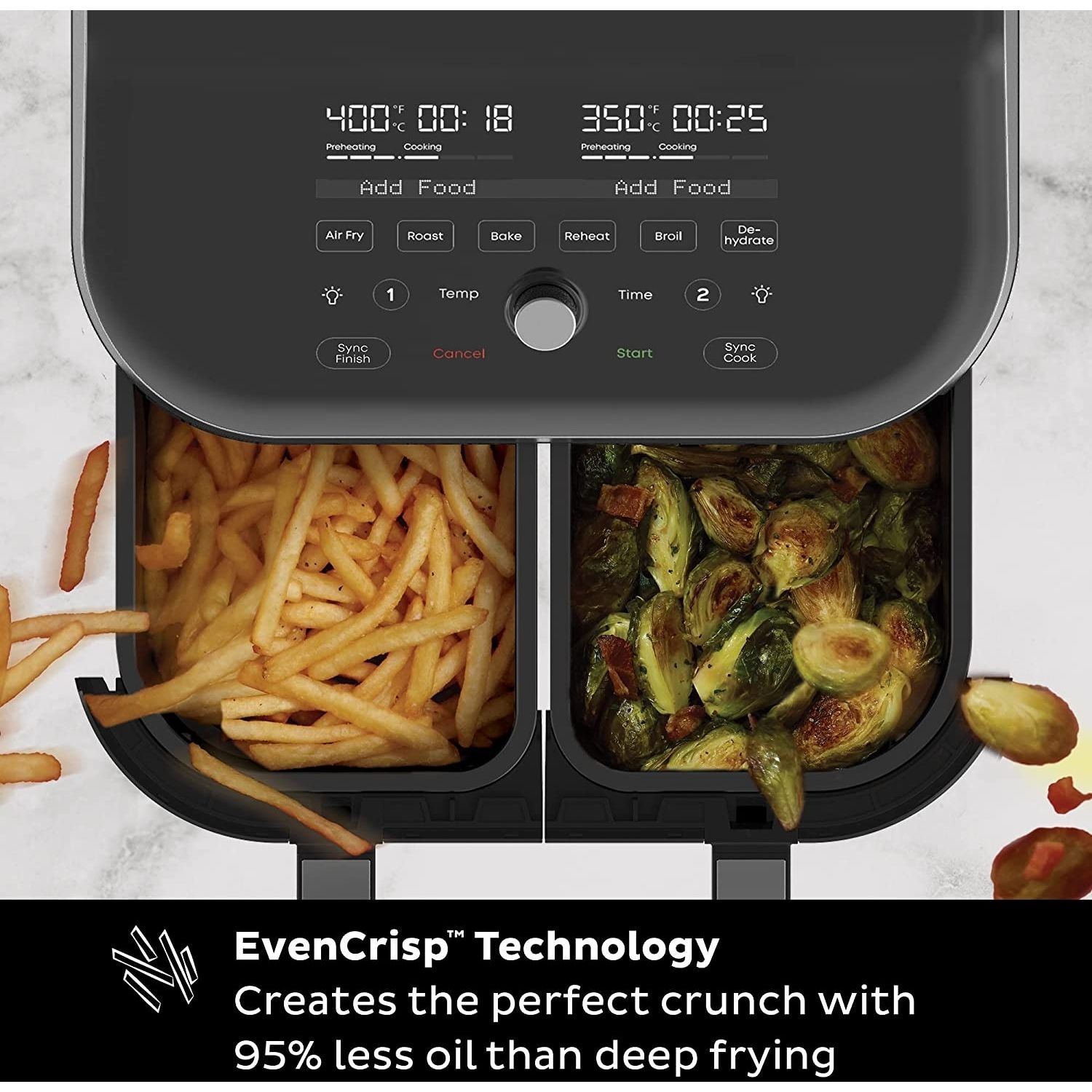 Nu este o friteuză cu aer comprimat obișnuită, ci are două coșuri separate de 3,8 litri, fiecare cu propriul element de încălzire independent, ceea ce înseamnă că puteți găti la temperaturi diferite în același timp și că puteți termina ciclurile de gătit la momente diferite.