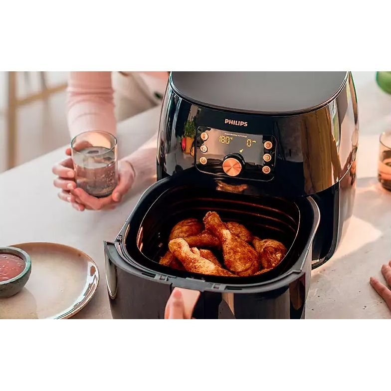 Rezultate perfecte, cu o singură apăsare de buton. Tehnologie Smart Sensing. Tehnologie de eliminare a grăsimii. Tehnologie Rapid Air. Culoare neagru-cupru, capacitate 1,4 kg.