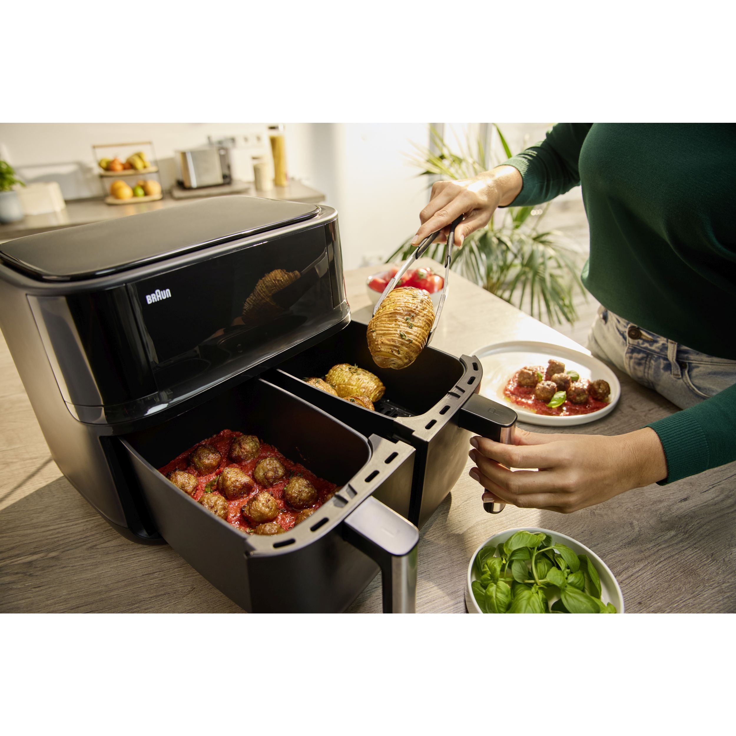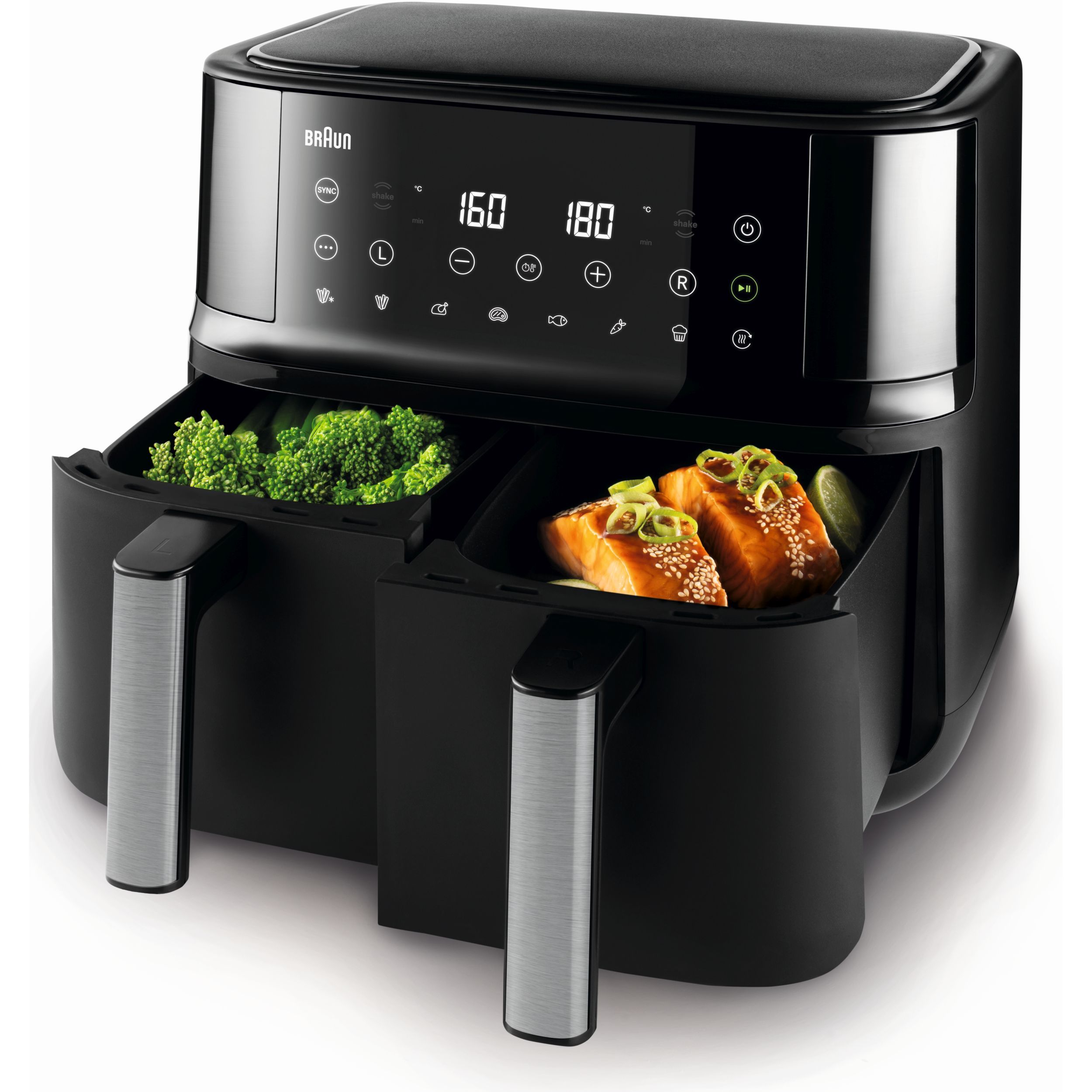 Bucură-te de o masă completă - noul TwinCook 3 de la BRAUN îți permite să gătești două preparate diferite simultan, creând o masă completă cu 50% mai rapidă*. Spune adio grijilor legate de sincronizare: o apăsare a butonului Sincronizare și ambele preparate sunt gata în același timp. Un mod sănătos de a găti, folosind cu până la 90% mai puțină grăsime*, fără a sacrifica aroma sau textura. Iar sertarele care pot fi spălate în mașina de spălat vase fac curățarea ușoară.