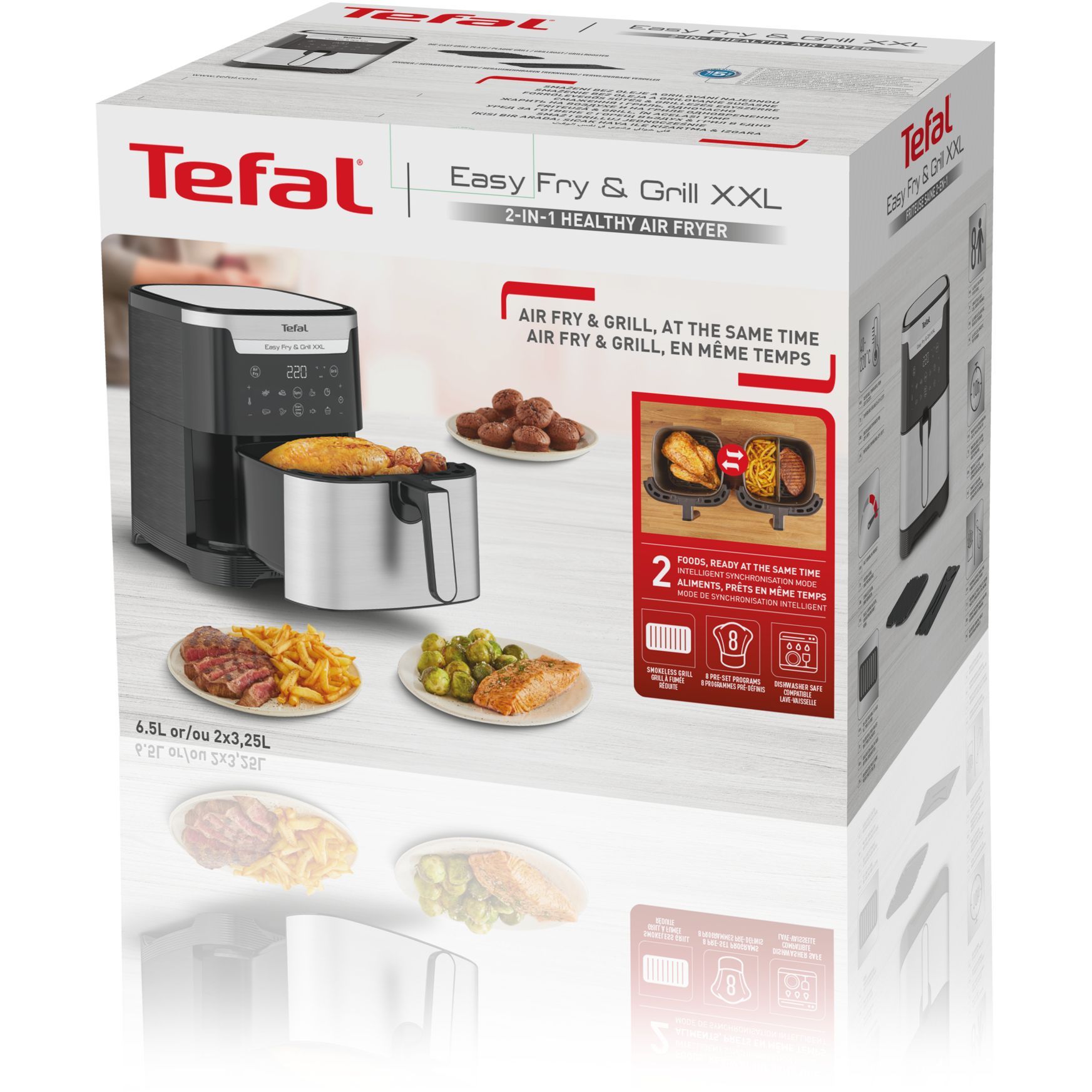 Prepara retete delicioase si sanatoase pentru pana la 8 persoane cu friteuza electrica cu aer cald, cu accesoriu gratar Tefal Easy Fry & Grill XXL. Separatorul detasabil iti va permite sa prepari 2 retete simultan cu ajutorul modului inteligent de sincronizare sau o cantitate mare datorita capacitatii XXL.