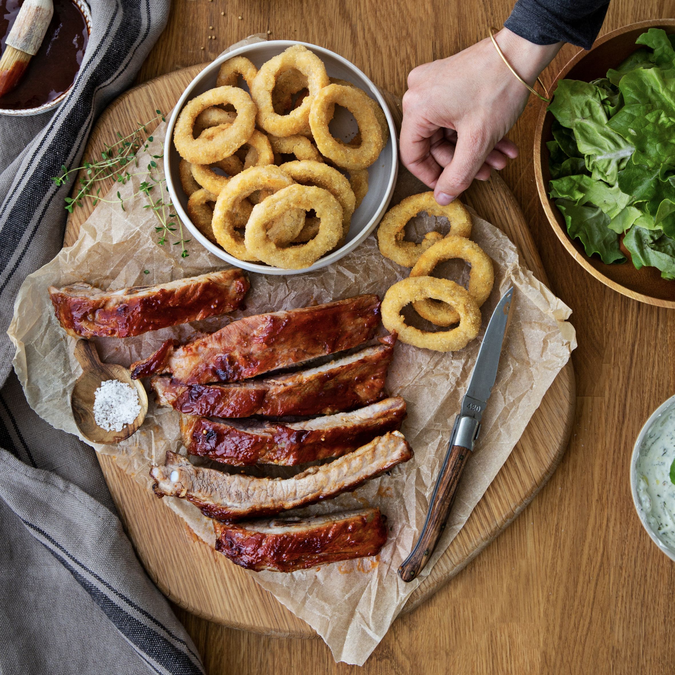 5. Introduceți tava de grătar și divizorul în aparat. Apăsați butonul Sincronizare și selectați modul PUI LA CUPTOR pentru P1. Pentru P2, selectați modul PEŞTE. Mai întâi, adăugați jumătate din coastele de porc într-una din părţi. Dacă este necesar, tăiațile în secțiuni, astfel încât să intre în aparat, și așezați-le cu partea cu carne în jos. Când sună cronometrul, întoarceţi coastele şi adăugaţi inelele de ceapă în partea cealaltă a divizorului. Reluați gătitul. După 10 minute de gătit, adăugaţi sos BBQ pe coastele de porc și întoarceți rondelele de ceapă. Reluați gătitul.