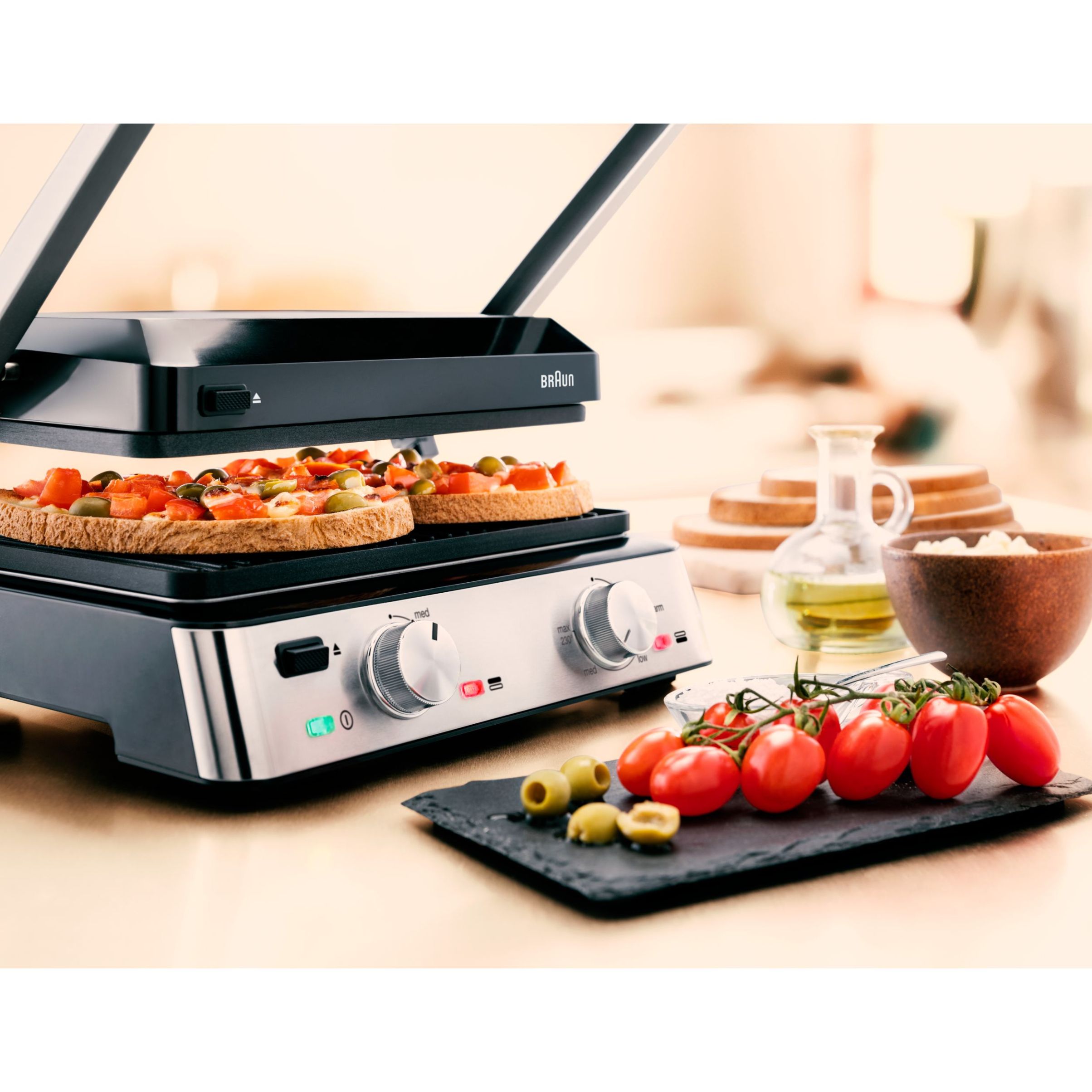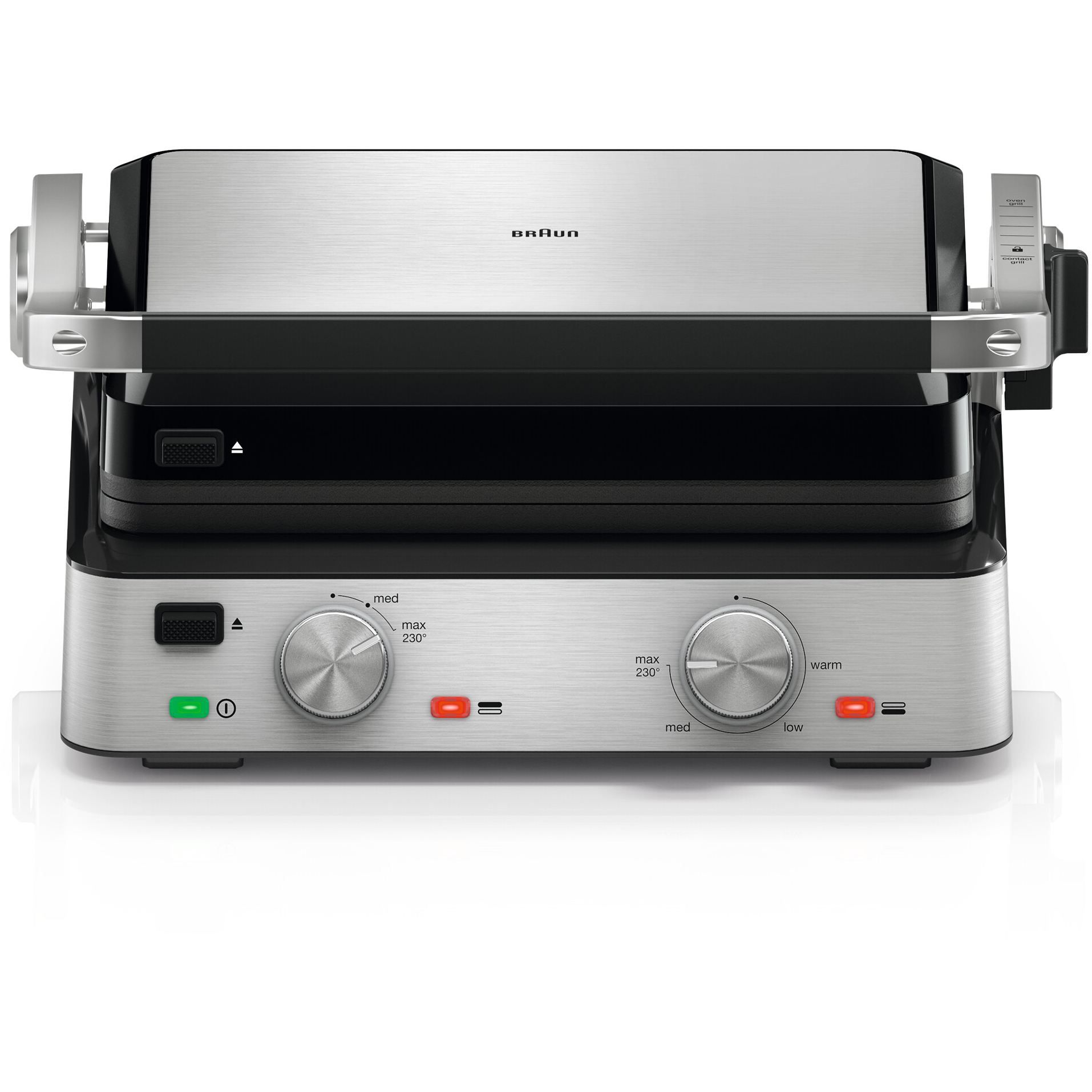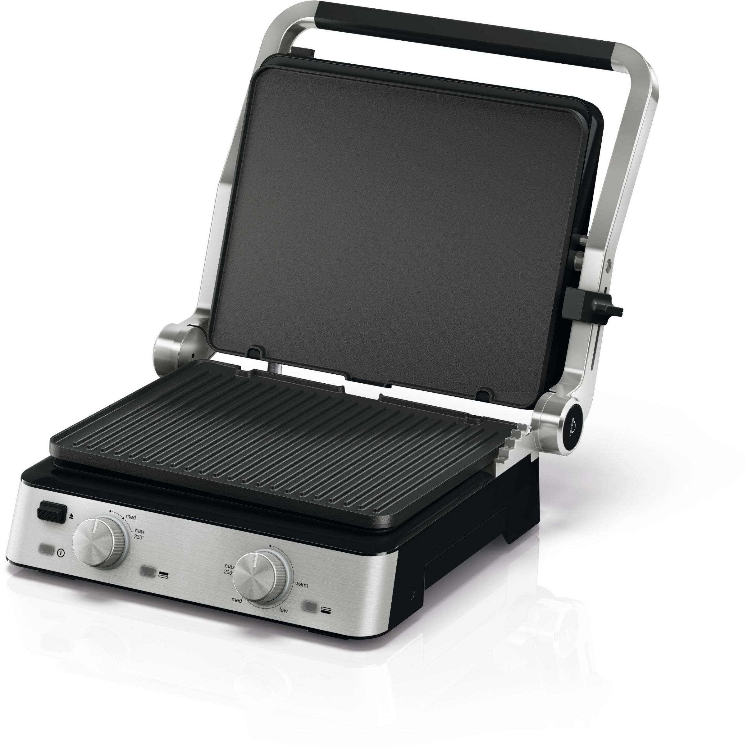 Versatilitate maximă datorită modului flexibil de poziționare a grătarului:deschis, tip cuptor sau în direct contact cu alimentele.