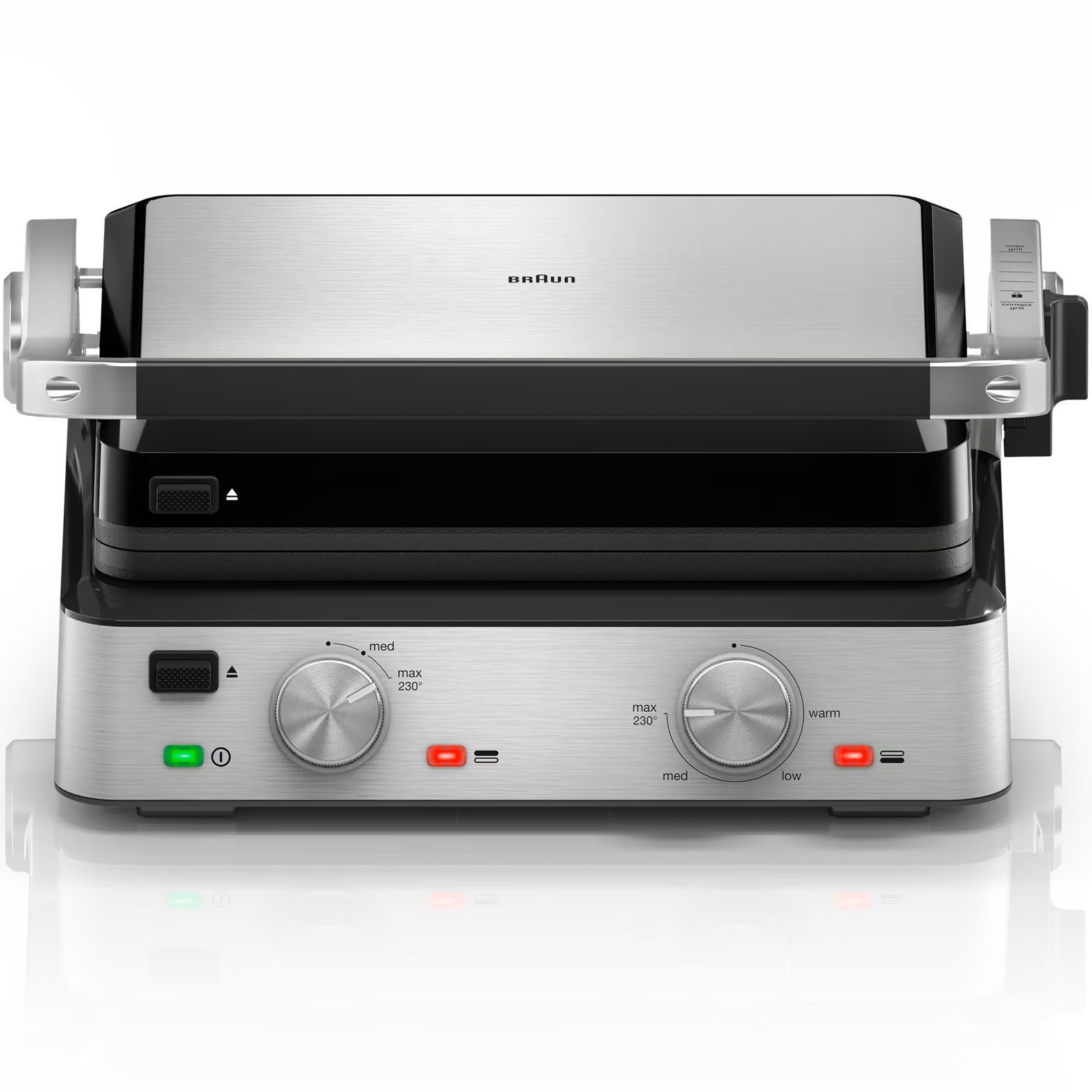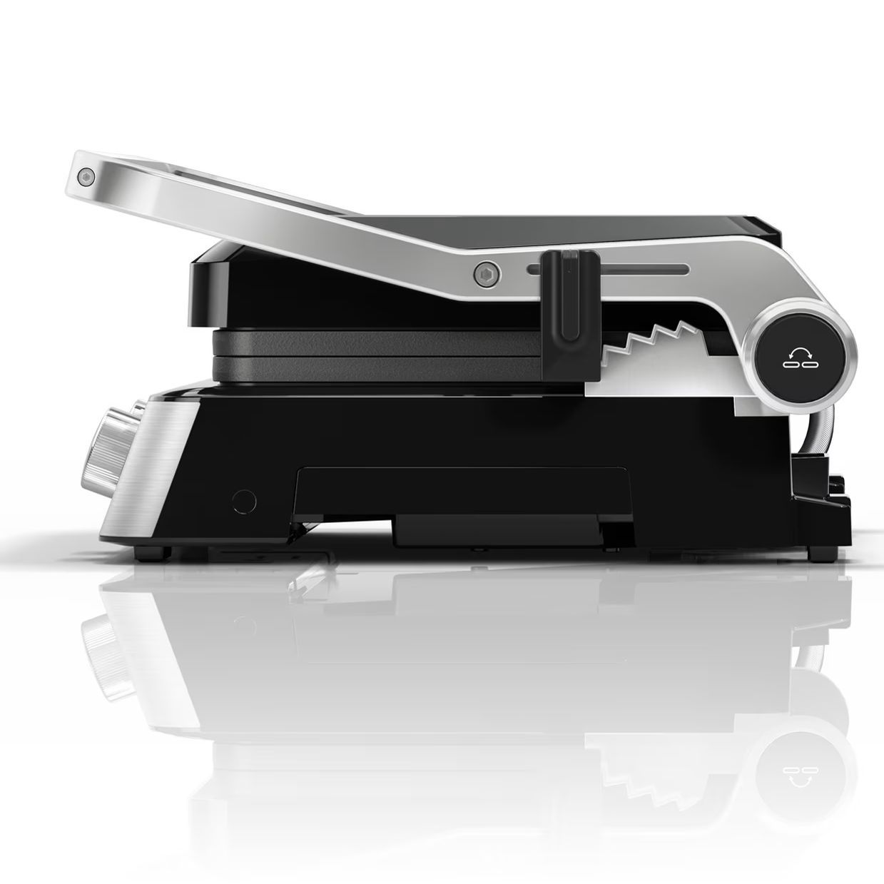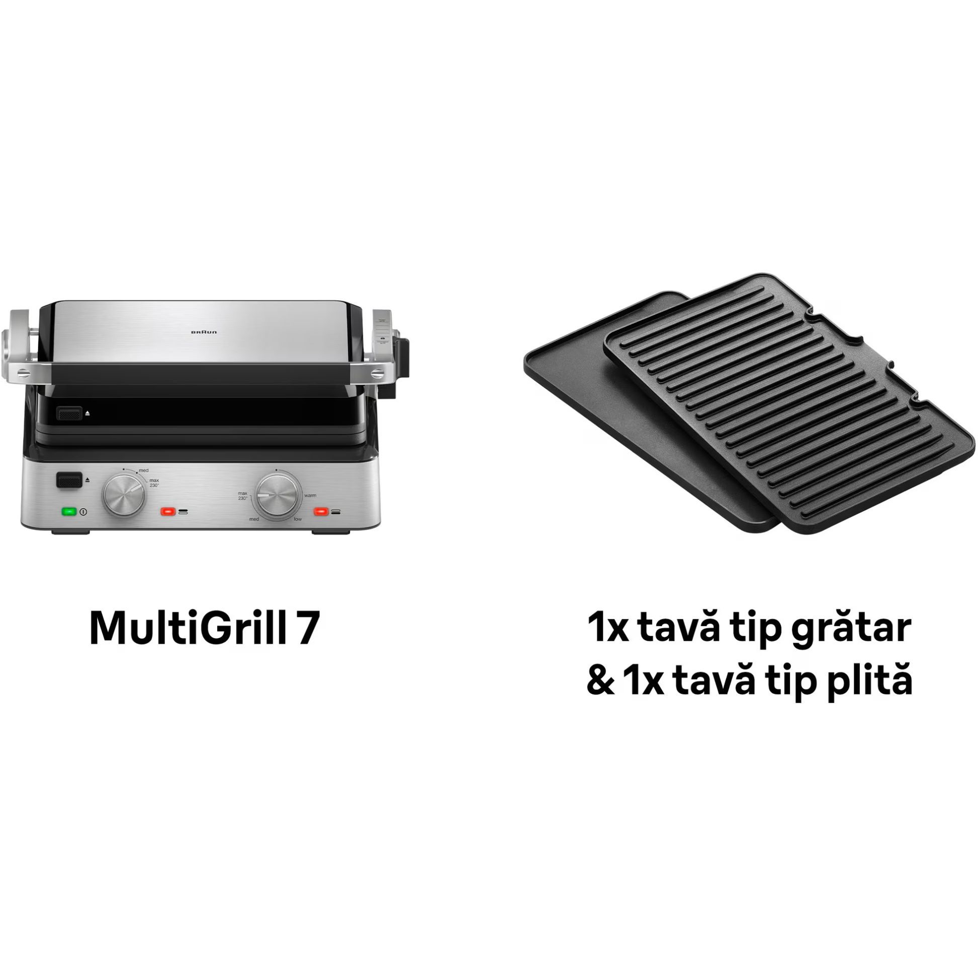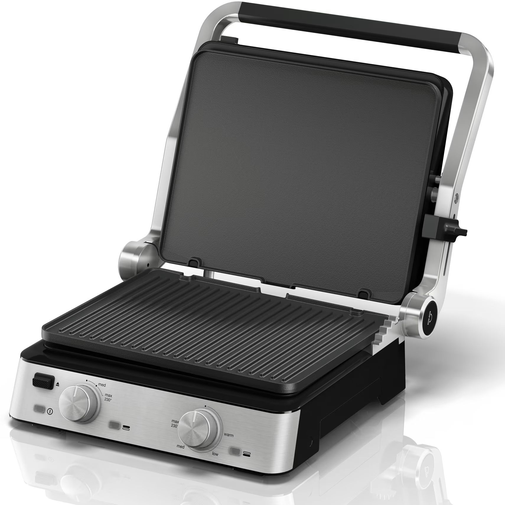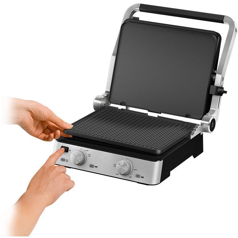 3 moduri de gătit într-un singur produs. Versatilitate maximă datorită modului flexibil de poziționare a grătarului: deschis, tip cuptor sau în direct contact cu alimentele.