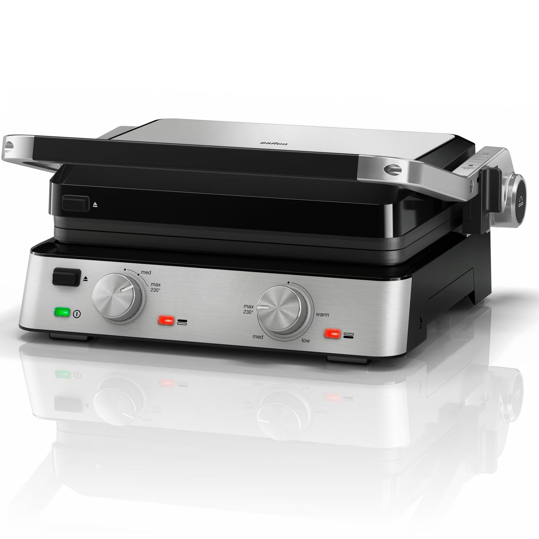 Performanță excelentă la grătar. Elementele de încălzire încorporate garantează o încălzire mai rapidă și uniformă. Iar datorită termostatelor independente, temperatura fiecărei tăvi se poate regla separat pentru a găti două tipuri de alimente simultan.