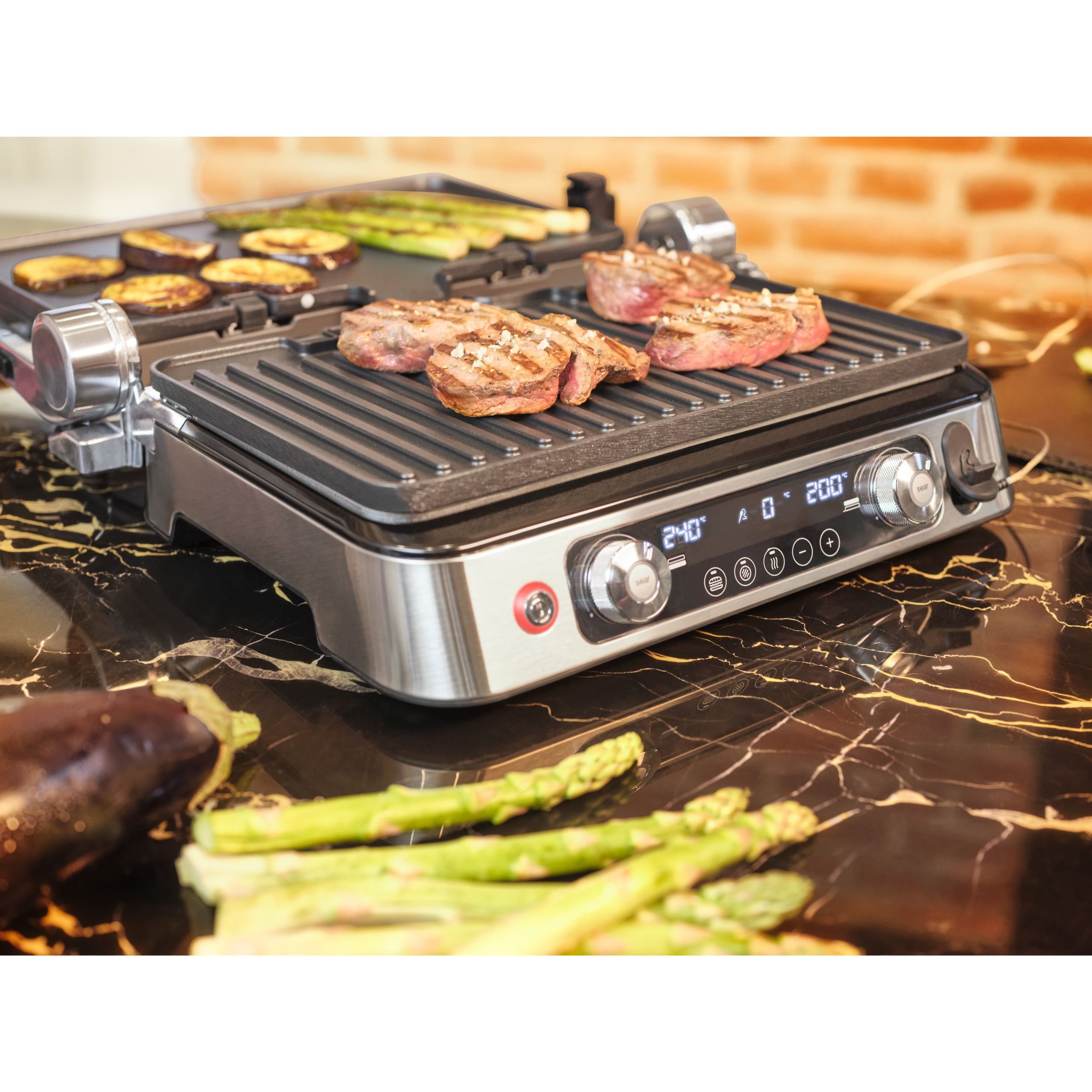 Temperatura fiecărei plăci se poate regla cu precizie, astfel încât să poți găti simultan două tipuri de alimente la două temperaturi diferite.