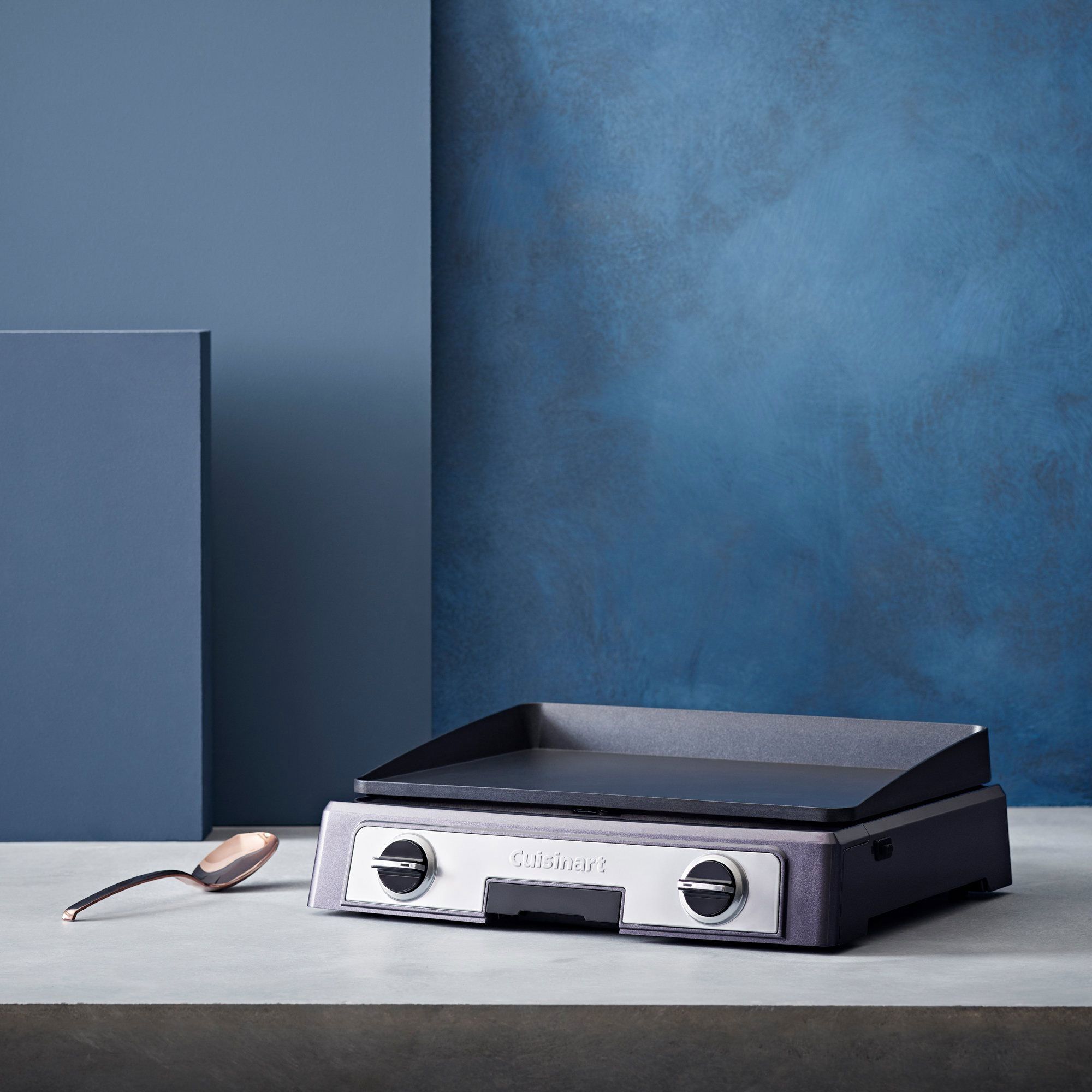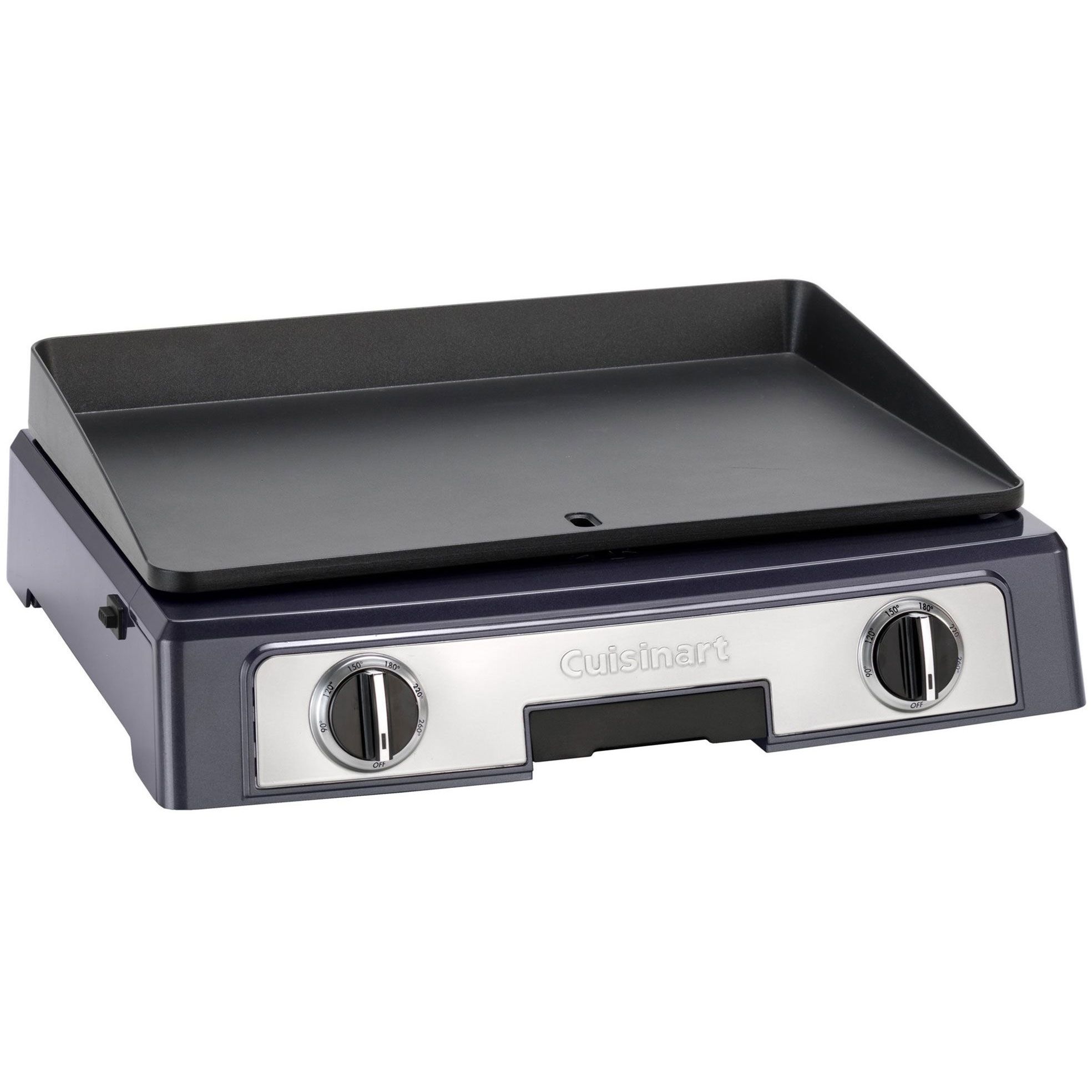 Grătar electric cu plită detaşabilă, dotat cu scut antistropire, putere 2200 W, marca Cuisinart. Plita pentru grătar este fabricată din fontă, are suprafata netedă şi este potrivită pentru a găti ouă, clătite, carne, peşte, dar şi scoici, calamar, creveţi sau alte crustacee.