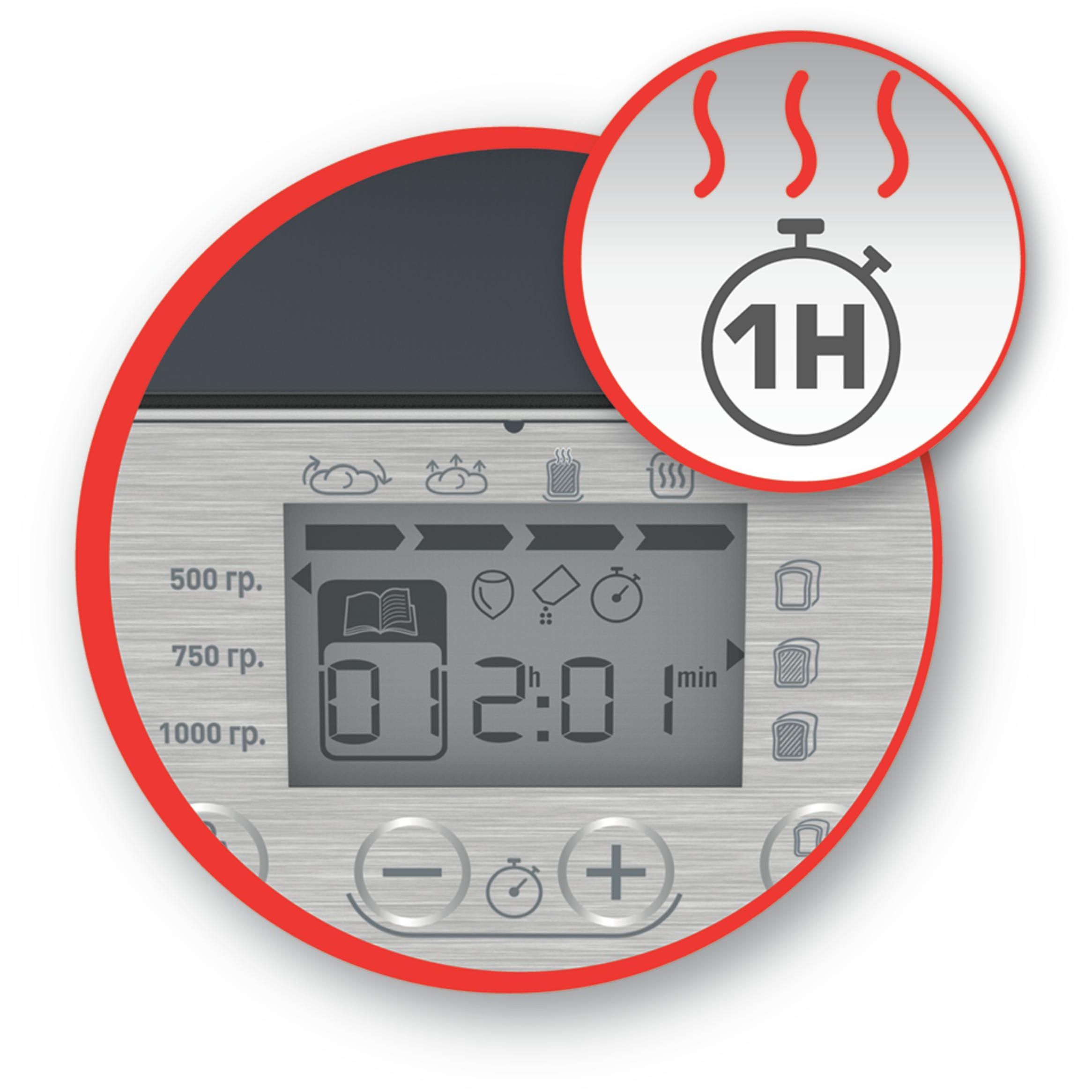 Puteți programa mașina pentru a avea pâine proaspăt coaptă la ora pe care o doriţi. Setarea pentru “pornire întârziată” este disponibilă până la maxim15 ore. Mașina dispunde și de o funcție de menținere la cald timp de 1 oră.