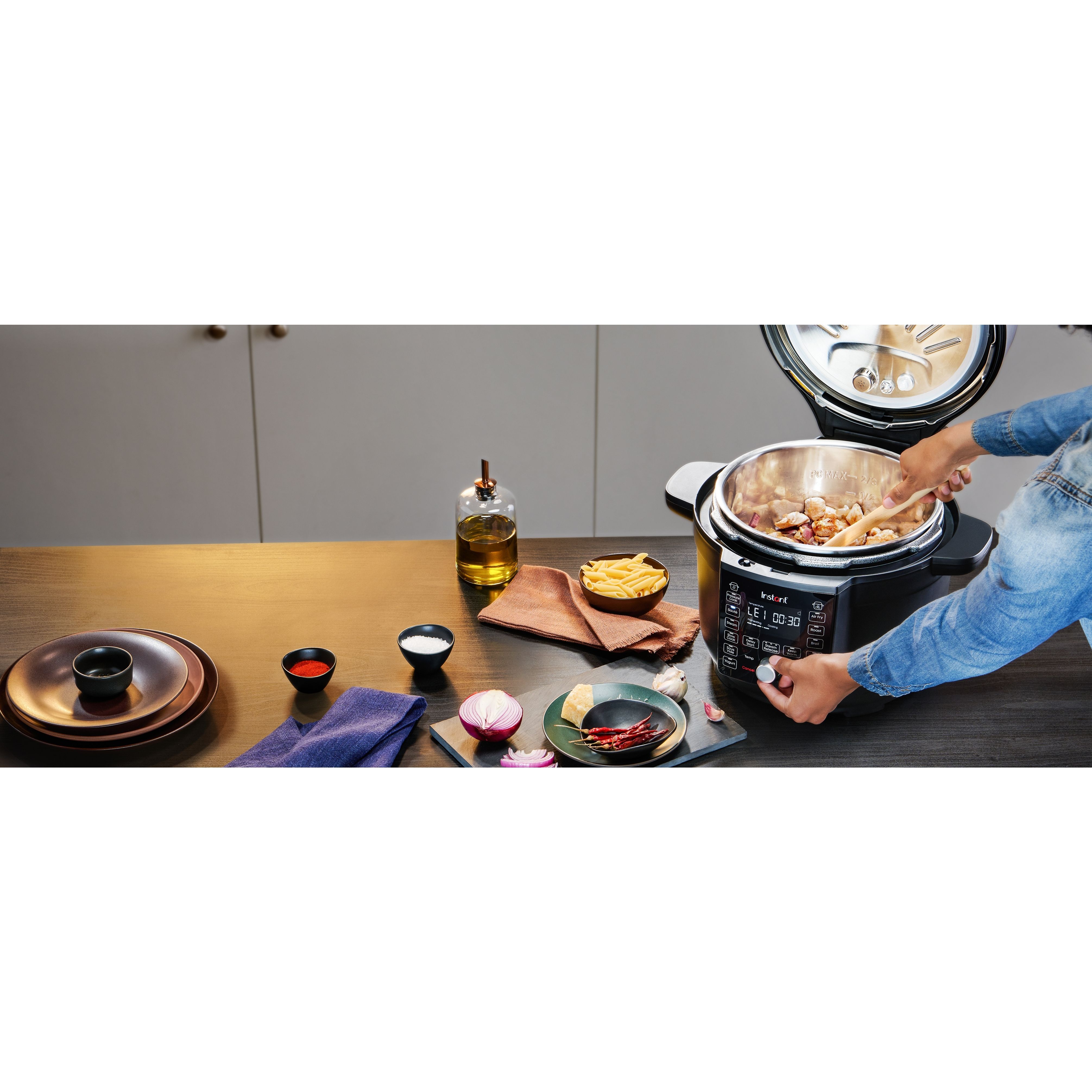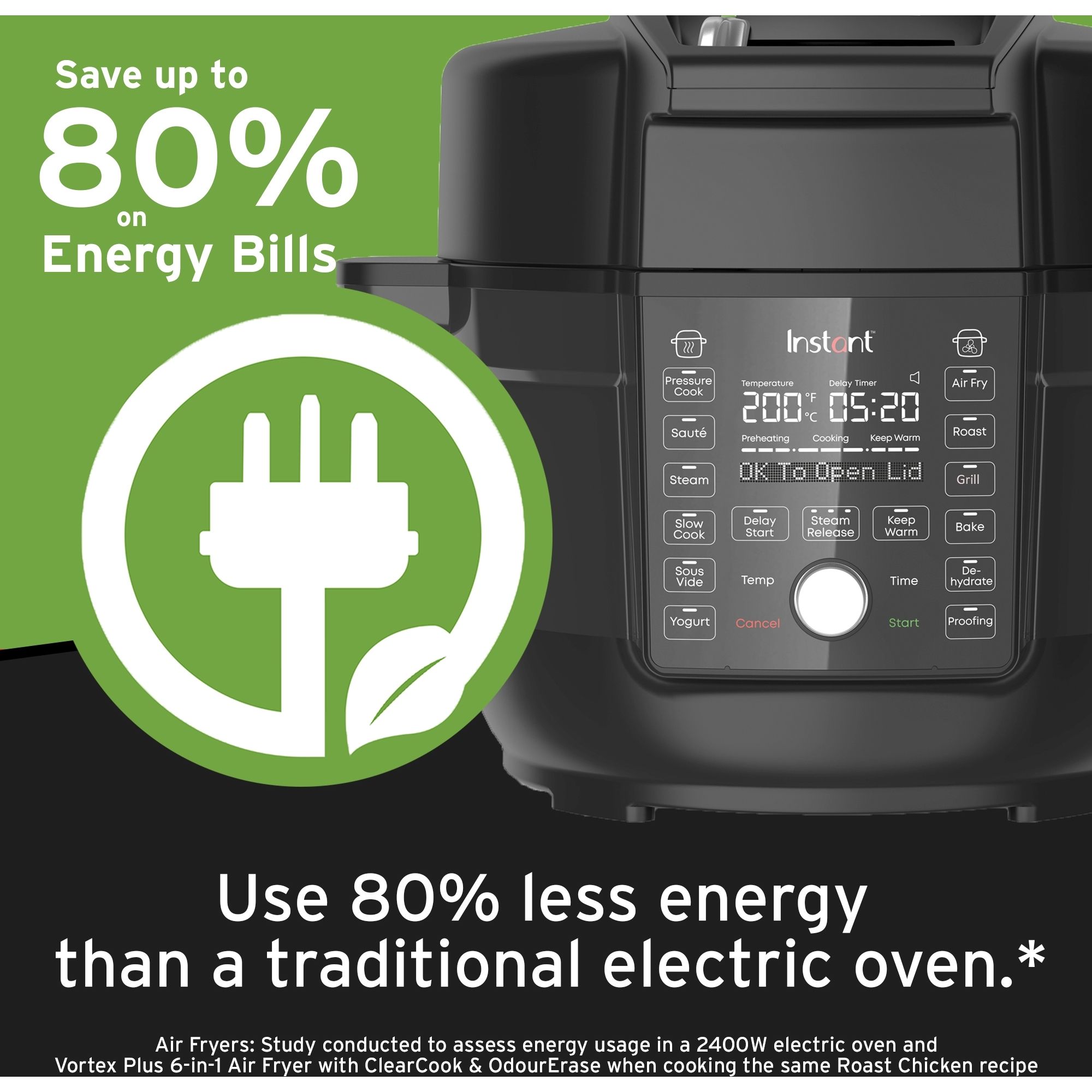 Recentul nostru studiu independent a arătat că gătitul cu un Instant Pot sau Air Fryer utilizează de 4,4 ori mai puțînă energie necesară decât în cuptor, economisind energie și costuri*, oferindu-vă un motiv în plus pentru a-l folosi la fiecare masă.
