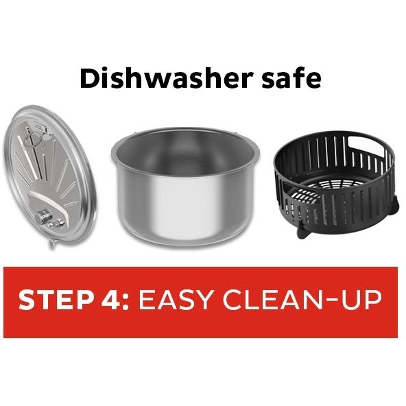 Care rezultă în mâncăruri delicioase, este și mai bună cu cea mai simplă curățare ulterioară, cu o oală de gătit, un coș de prăjire în aer și un capac pentru gătit sub presiune, care pot fi spălate în mașina de spălat vase.