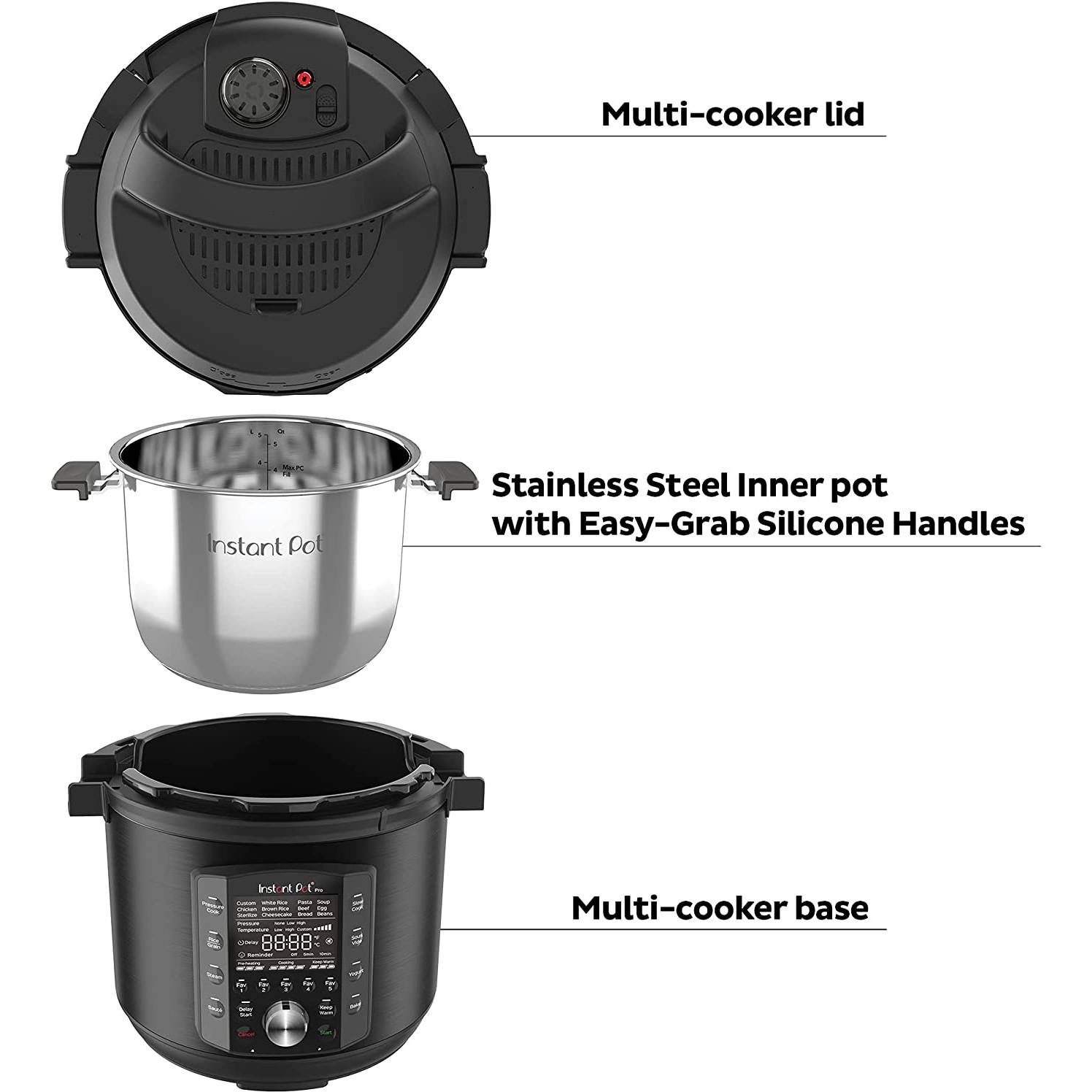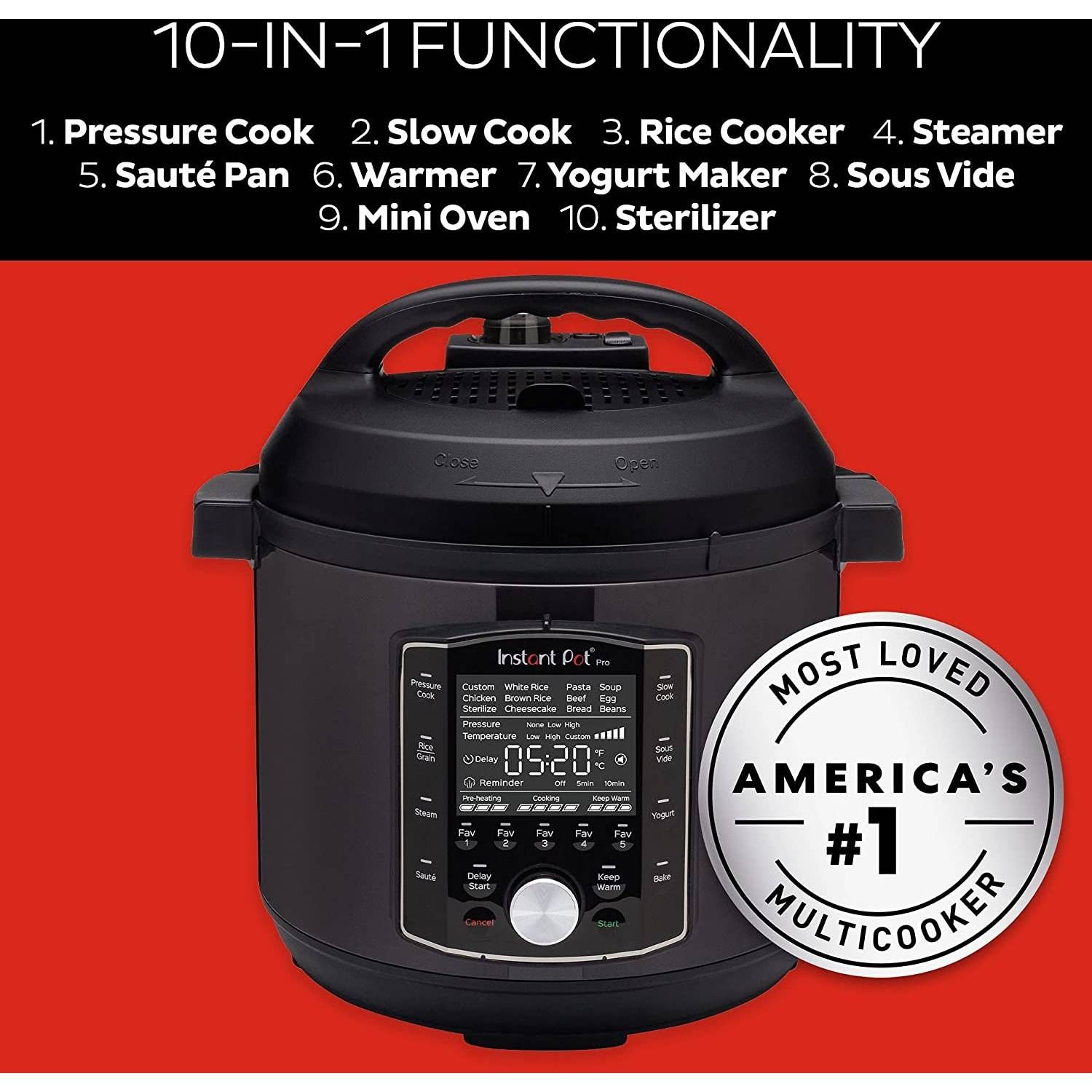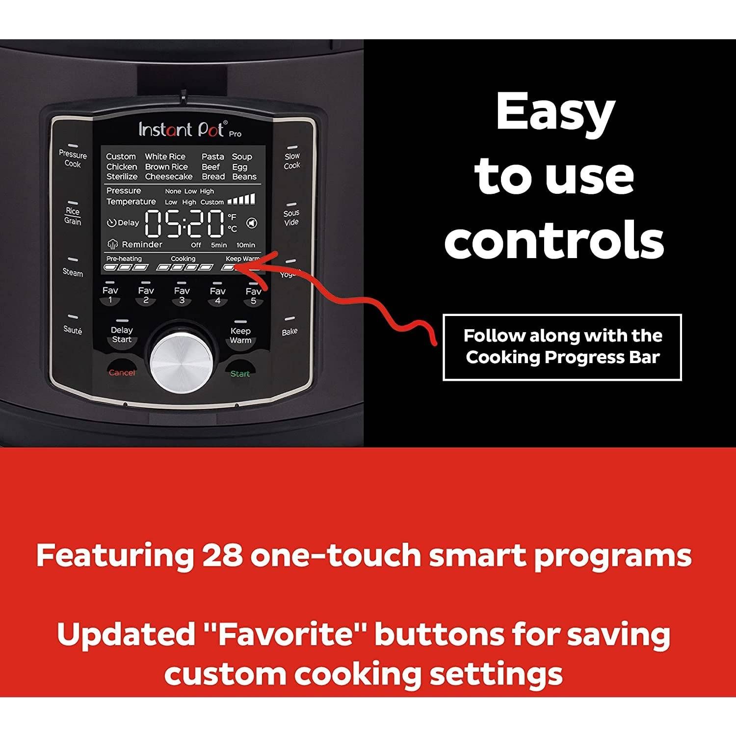 Experimentați următoarele generații de confort cu Instant Pot® Pro. Începe cu 28 de programe inteligente de gătit și adaugă 5 setări noi ale programului Favorite. Petreceți mai puțin timp în bucătărie cu preîncălzirea cu 20% mai rapid și cu 70% mai rapid de gătit în general. Eliberarea ușoară a aburului îmbunătățită este mai silențioasă și mai puțin murdară cu capacitatea difuză. Iar Pro este plin de elemente suplimentare, precum mânerele Easy Grip de pe vasul interior, un ecran LCD mare, ușor de citit și un capac de etanșare automată.
