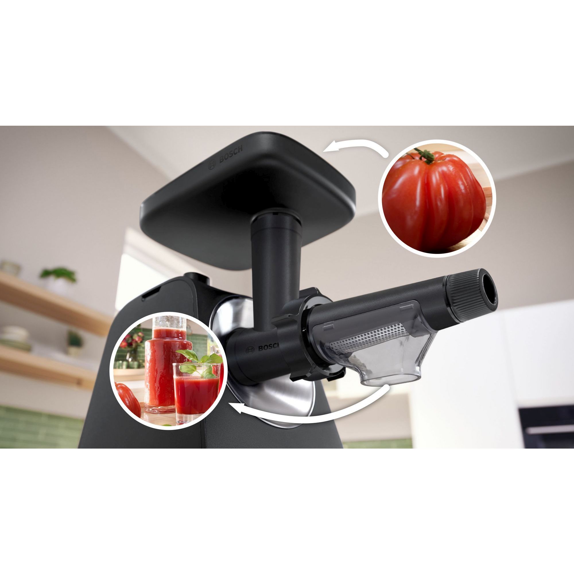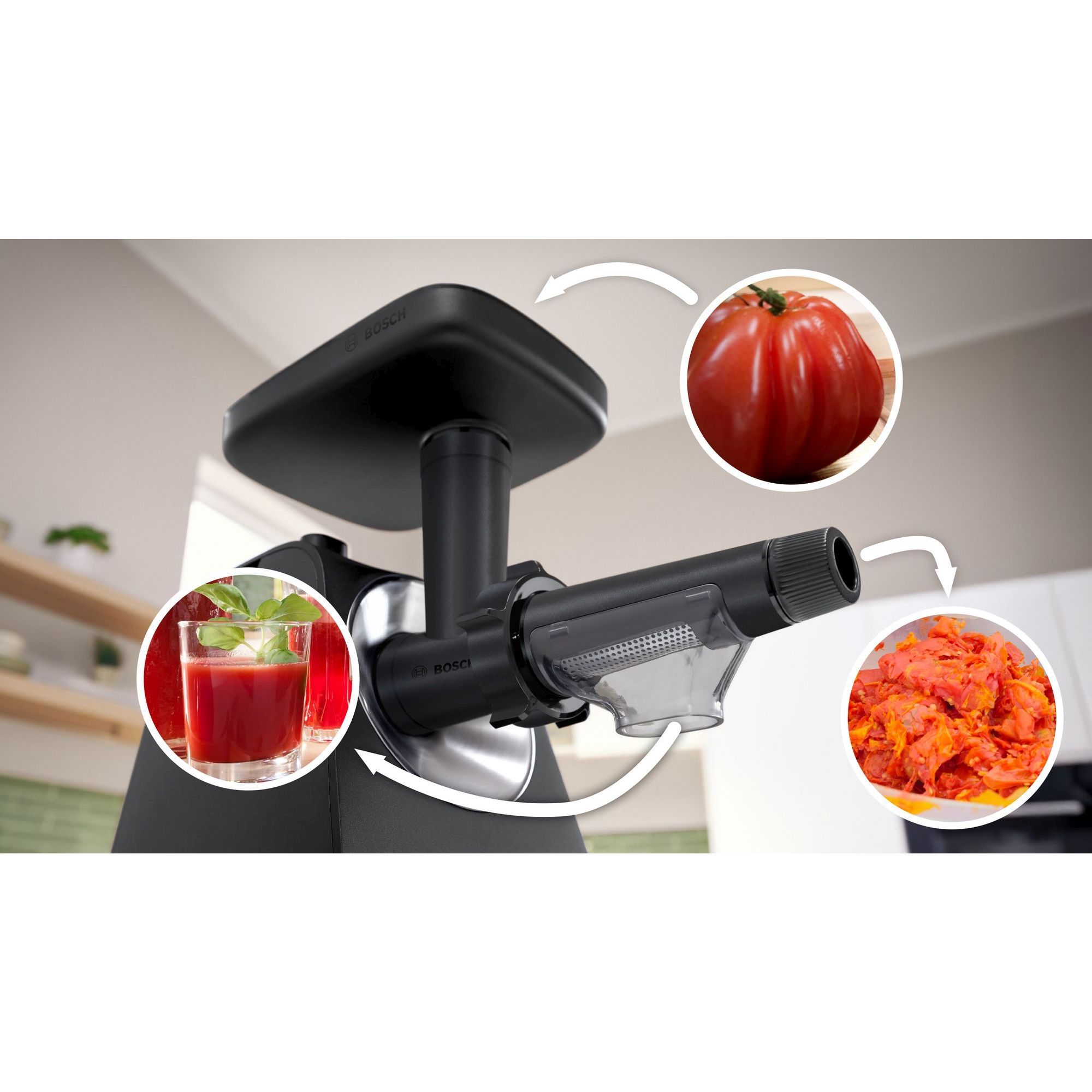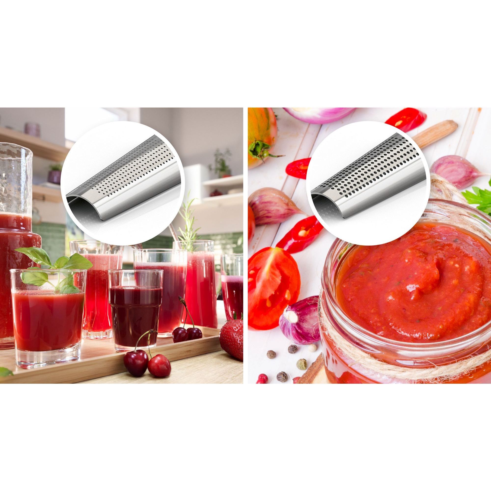 Să faci sus de roșii acasă necesită uneori mult efort. Cu accesoriul pentru stoarcerea fructelor, este ușor să faci sucuri sănătoase. Cu ajutorul acestui accesoriu poți stoarce fructe și legume moi precum roșii sau fructe de pădure. Poți îndepărta chiar și sâmburii din coacăze.