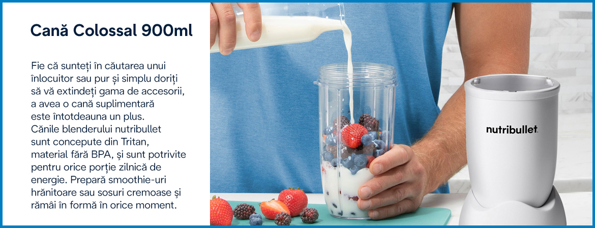 Fie că sunteți în căutarea unui înlocuitor sau pur și simplu doriți să vă extindeți gama de accesorii, a avea o cană suplimentară este întotdeauna un plus. Această cană poate conține 900ml (32 oz) din ingredientele proaspăt amestecate.