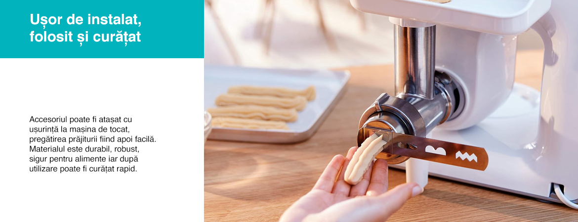 Accesoriul poate fi atașat cu ușurință la mașina de tocat, pregătirea prăjiturii fiind apoi facilă. Materialul este durabil, robust, sigur pentru alimente iar după utilizare poate fi curățat rapid.