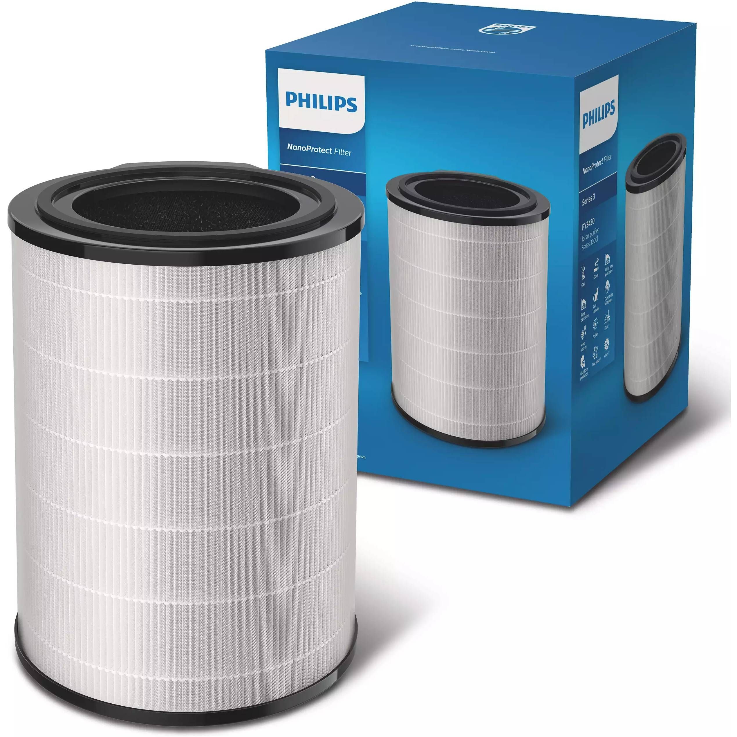 Filtru Filtru Nano Protect FY3430/30, HEPA și cu carbon activ integrat captează eficient particulele periculoase, mici, de până la 0,003 um, inclusiv PM2,5, alergenii, bacteriile și virusurile.