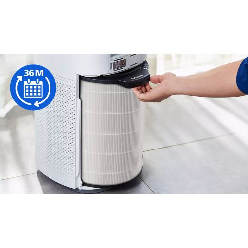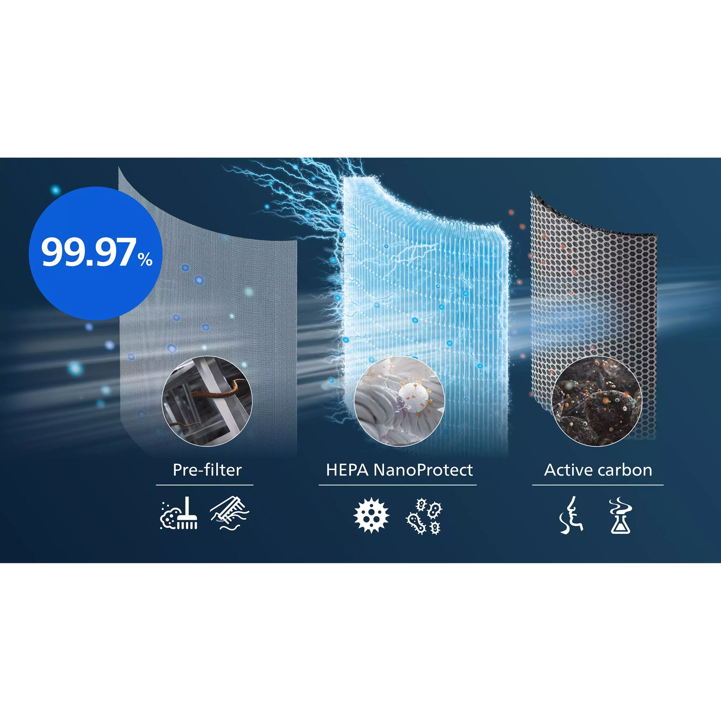 O filtrare în 3 straturi cu HEPA NanoProtect, carbon activ şi prefiltru asigură protecţia împotriva bacteriilor, polenului, prafului, PM2.5, părului de animale şi gazelor. Tehnologia HEPA NanoProtect nu doar captează substanţele poluante, ci foloseşte şi o sarcină electrostatică specială pentru a le atrage, permiţându-i să purifice aerul mai repede decât un filtru HEPA H13 care este utilizat medical.