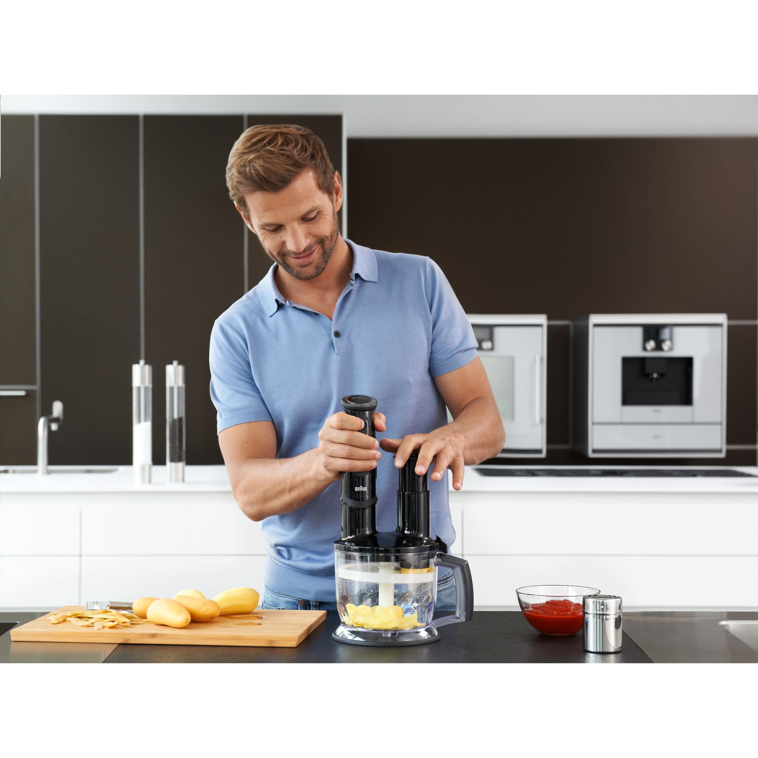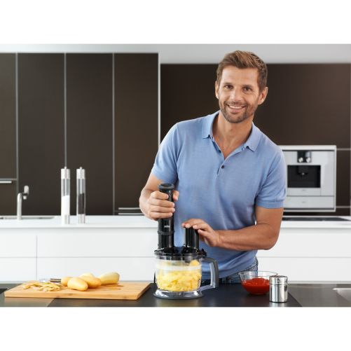 Acest accesoriu pentru procesarea alimentelor este ajutorul dumneavoastră universal în bucătărie, deoarece este ideal pentru toate activitățile: tocare și amestecare, precum și tăiere în felii sau în fâșii subțiri, în special, pentru frământarea aluatului.