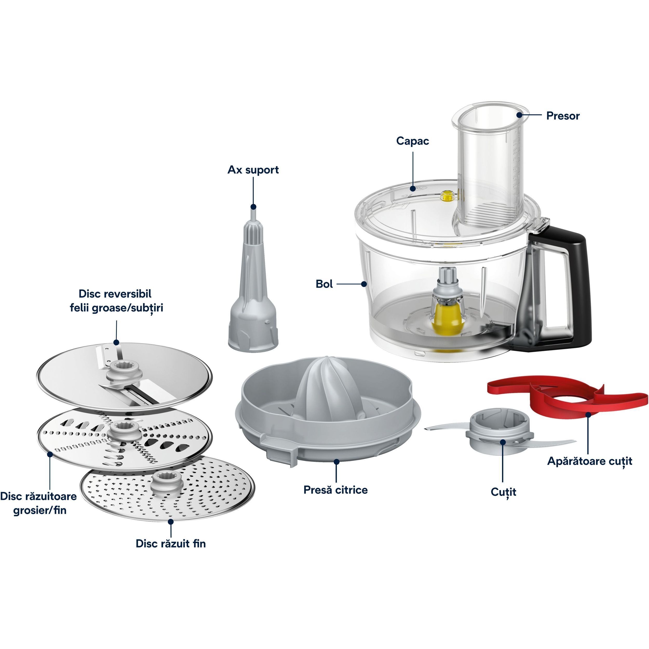 3 discuri incluse pentru o varietate imensă de feluri (disc de feliere reversibil, disc de răzuire reversibil și disc de răzuire rapidă mediu-fin)