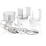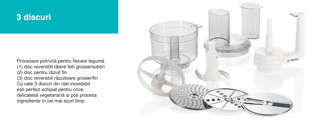 Procesare potrivită pentru fiecare legumă: (1) disc reversibil tăiere felii groase/subțiri; (2) disc reversibil răzuitoare grosier/fin; (3) disc pentru răzuit fin. Cu cele 3 discuri din oțel inoxidabil ești perfect echipat pentru orice delicatesă vegetariană și poți procesa ingrediente in cel mai scurt timp.