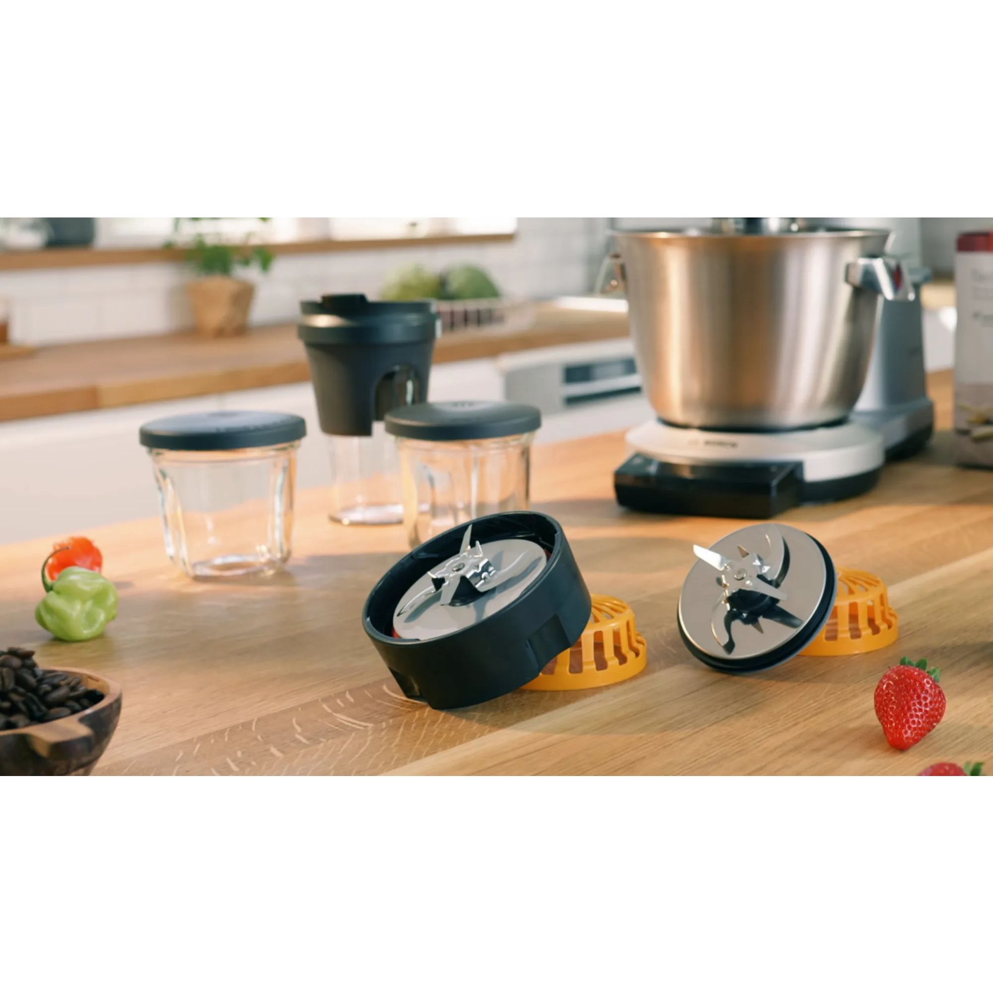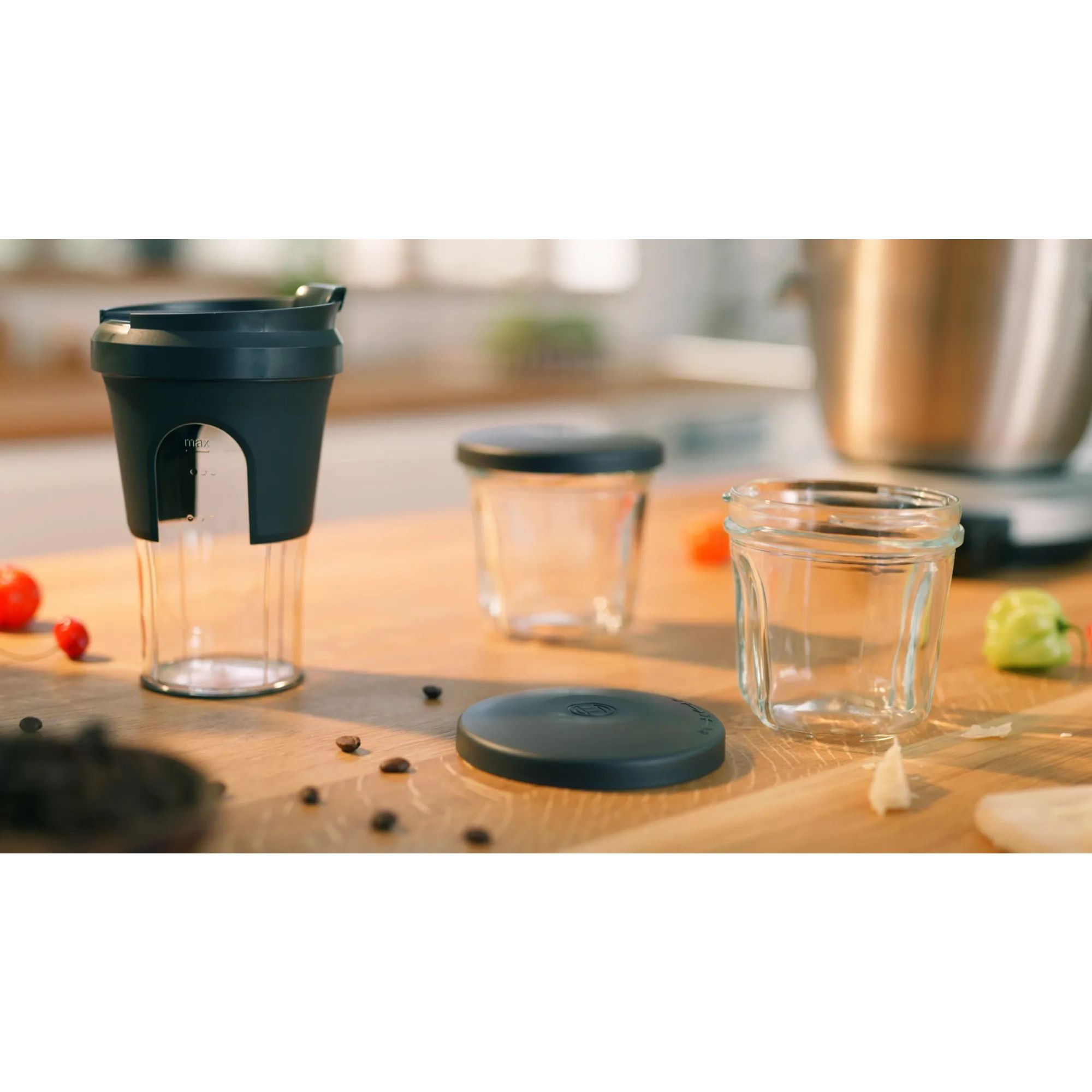 Pregătiți proaspăt, savurați imediat, luați cu dumneavoastră sau pur și simplu depozitați. Cele două recipiente din sticlă pentru depozitare precum și cel ToGo se închid ușor cu capace asortate. Astfel, puteți depozita totul convenabil.