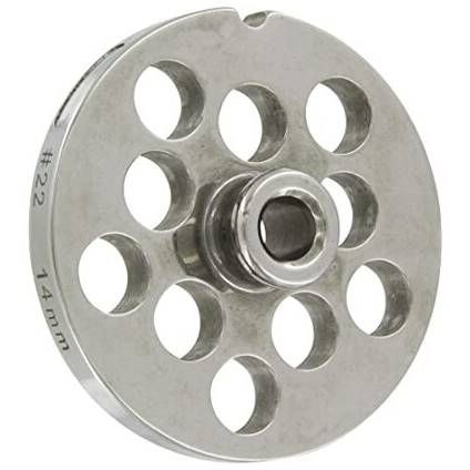Sita/discul perforat din inox cu grilaj de 14mm este compatibil cu mașina de tocat carne 9500N. Aceasta are un diametru de 53mm și o grosime de 6mm.