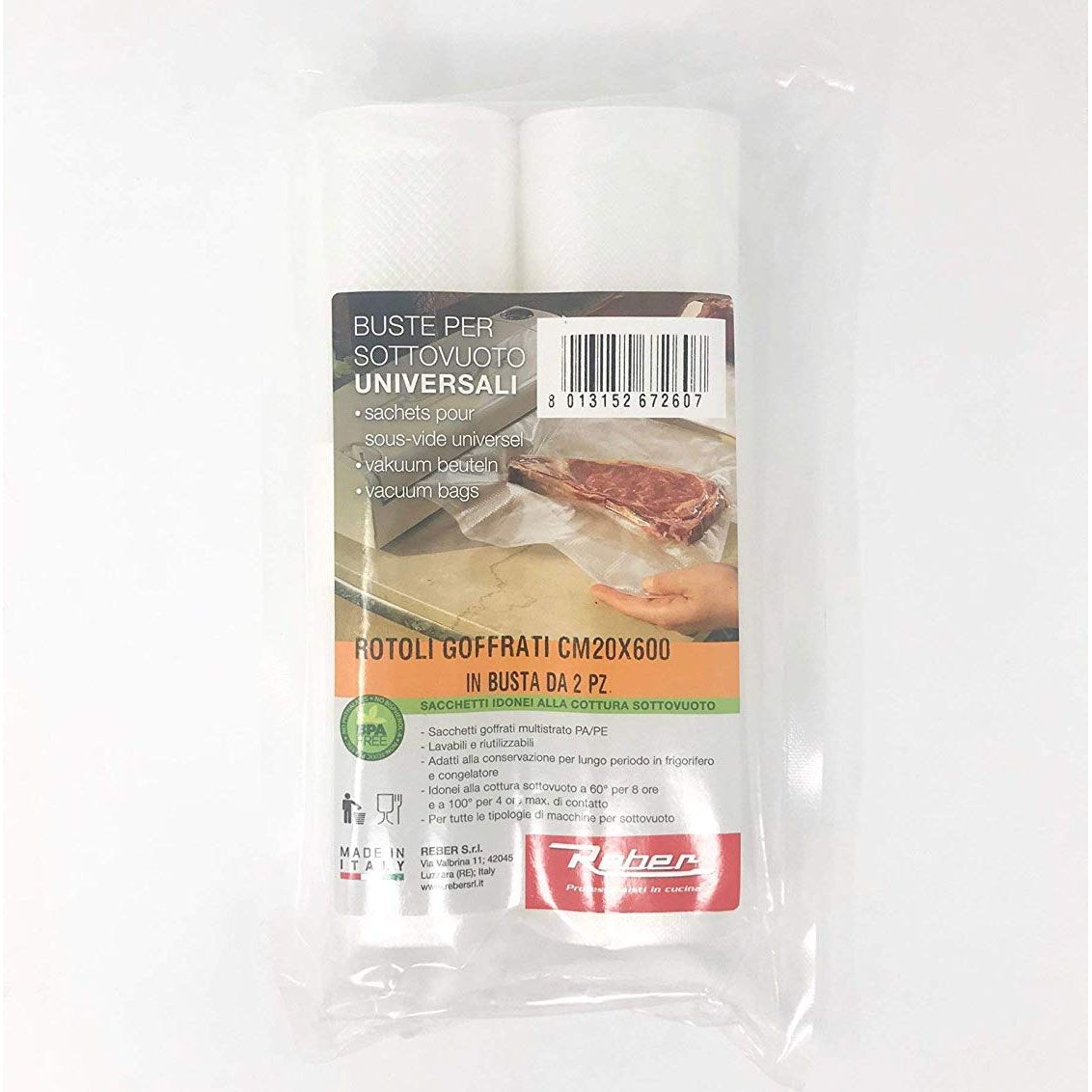 Role de folii gofrate pentru vidat Reber 6726 A, Dimensiune cumulată 20x600cm, Producție estimată 30 pungi (de 20x20cm), Pot fi folosite la gătit (set de 2 role)