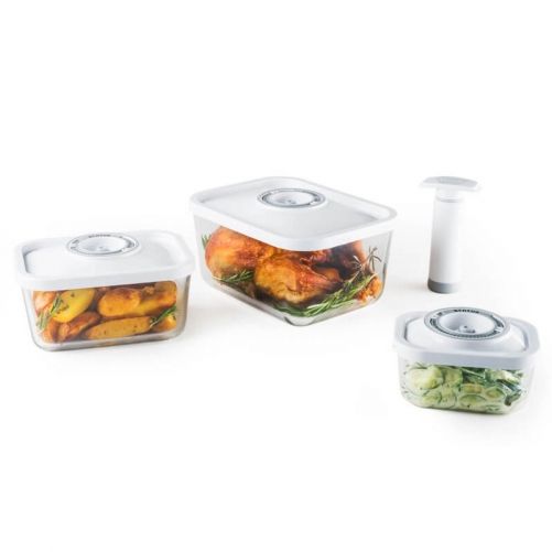 Set de caserole vacuum Status Glass format din 3 recipiente de sticlă (1x 0.5 litri, 1x 1.5 litri, 1x 3 litri) și o pompă manuală.