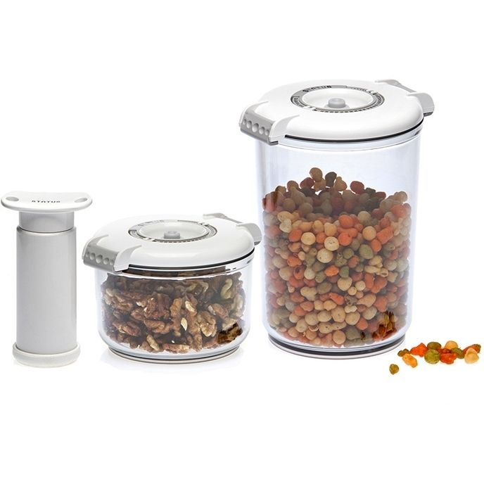 Set de caserole vacuum rotunde Status Round format din 2 recipiente de plastic, două tăvițe separatoare și o pompă manuală, Alb