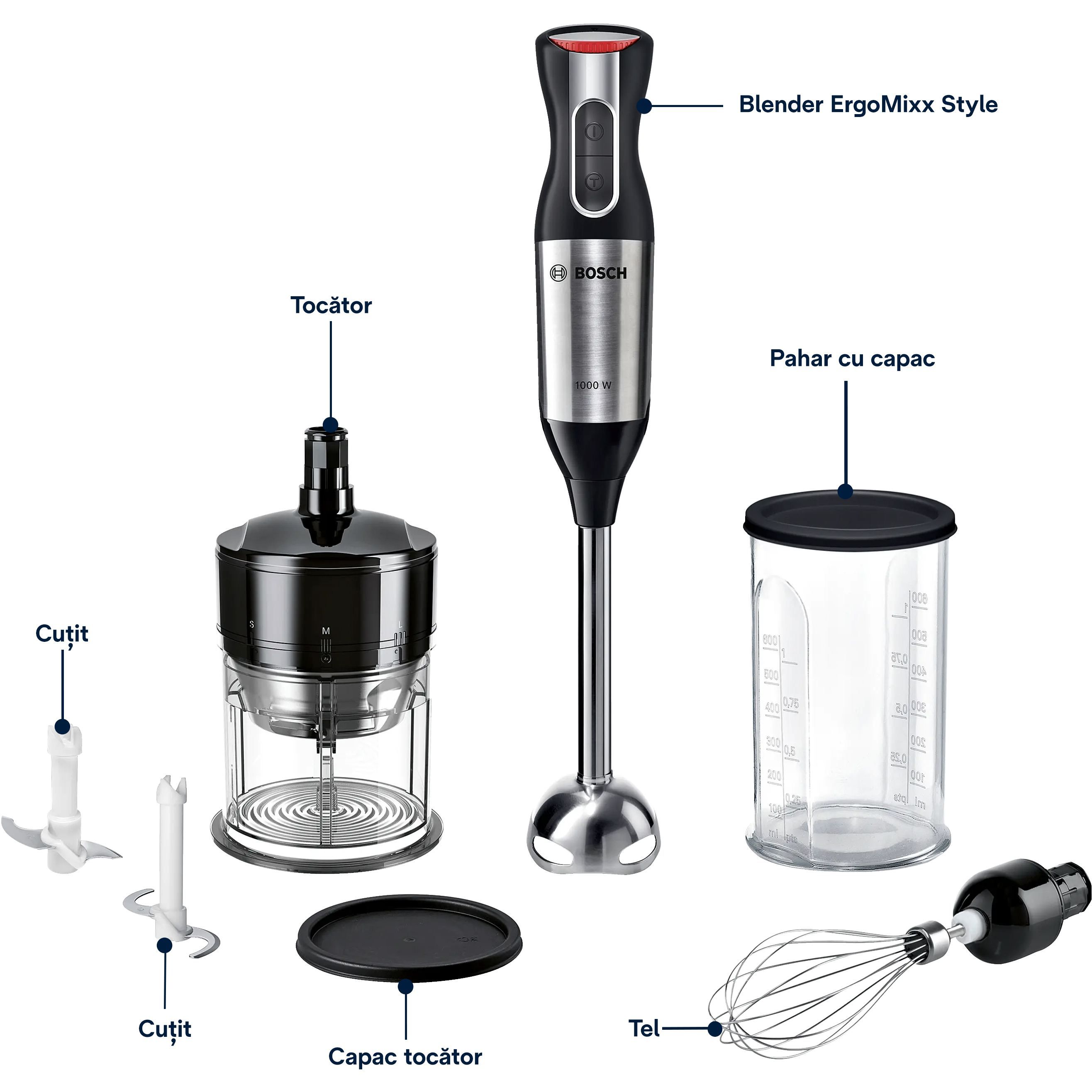 - Motor puternic de 1000 W: amestecă, toacă și pasează chiar și cele mai dificile ingrediente.