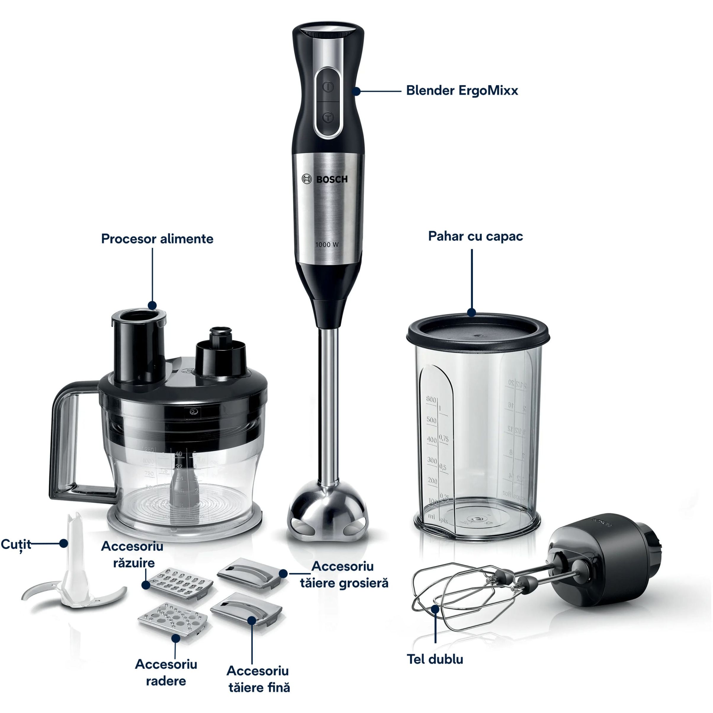 Datorită motorului puternic de 1000 W și a accesoriilor incluse acum este mult mai ușor să procesezi chiar și cele mai dificile ingrediente. Poți toca, mărunți sau amesteca ingredientele într-un timp foarte scurt cu ajutorul blenderului ErgoMixx.
