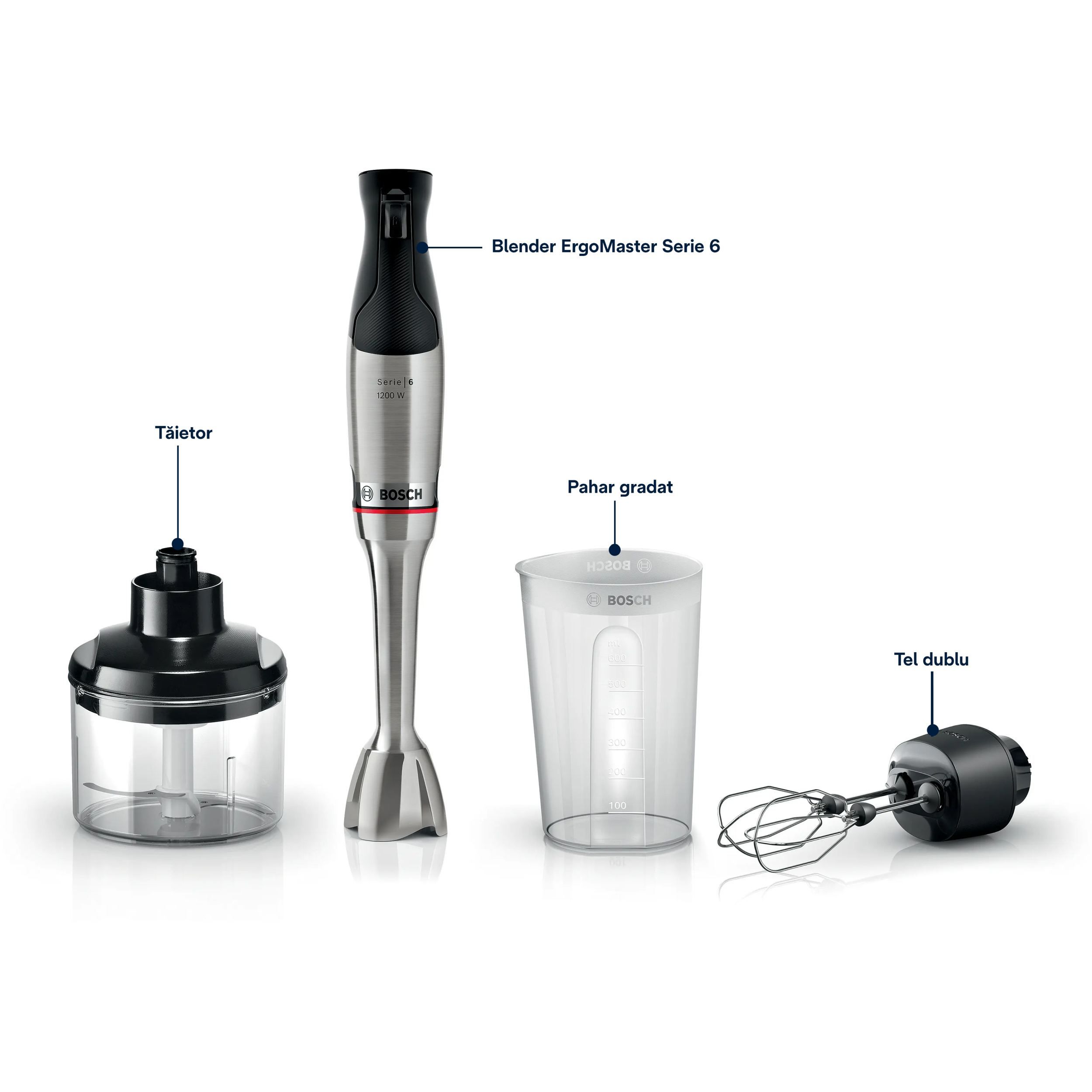 - Cuțit cu 4 lame și AntiSplash (previne stopirea accidentală)