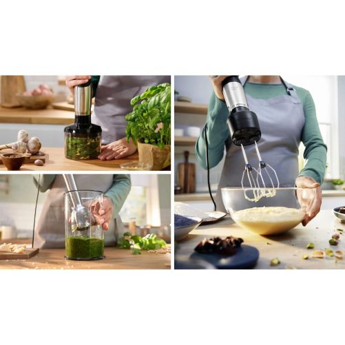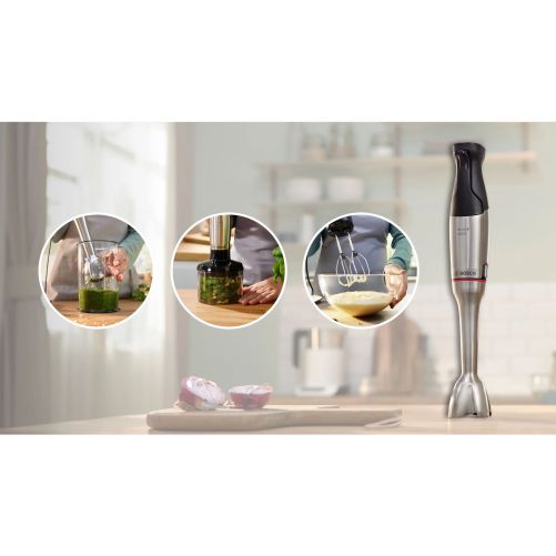 Folosirea blenderului cu o singură mână nu a fost niciodată mai ușoară. Designul compact îl face ușor de manevrat și confortabil în utilizare. Controlezi viteza de procesare cu ajutorul butonului mare de operare. Poate fi folosit cu ușurință atât de persoanele dreptace, cât și de cele stângace.