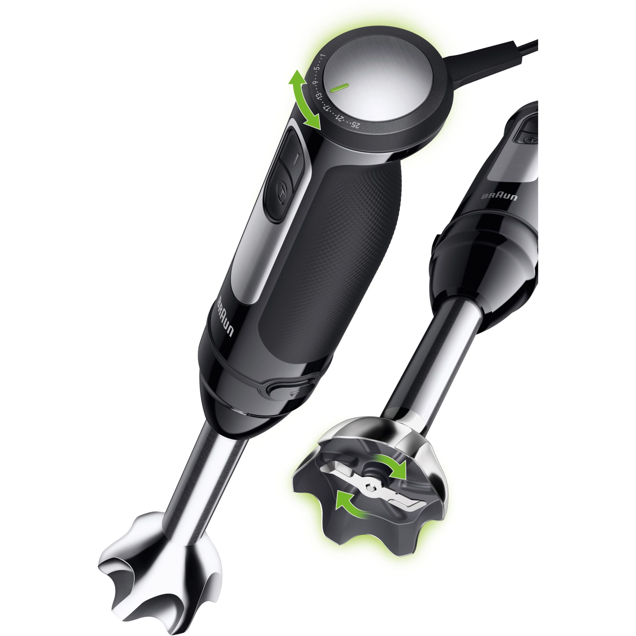Selector pentru viteză variabilă, acționabil cu o singură mână. Datorită celor 25 de viteze diferite + turbo poți alege viteza potrivită preparatului tău chiar în timpul utilizării, oferind astfel precizie maximă.