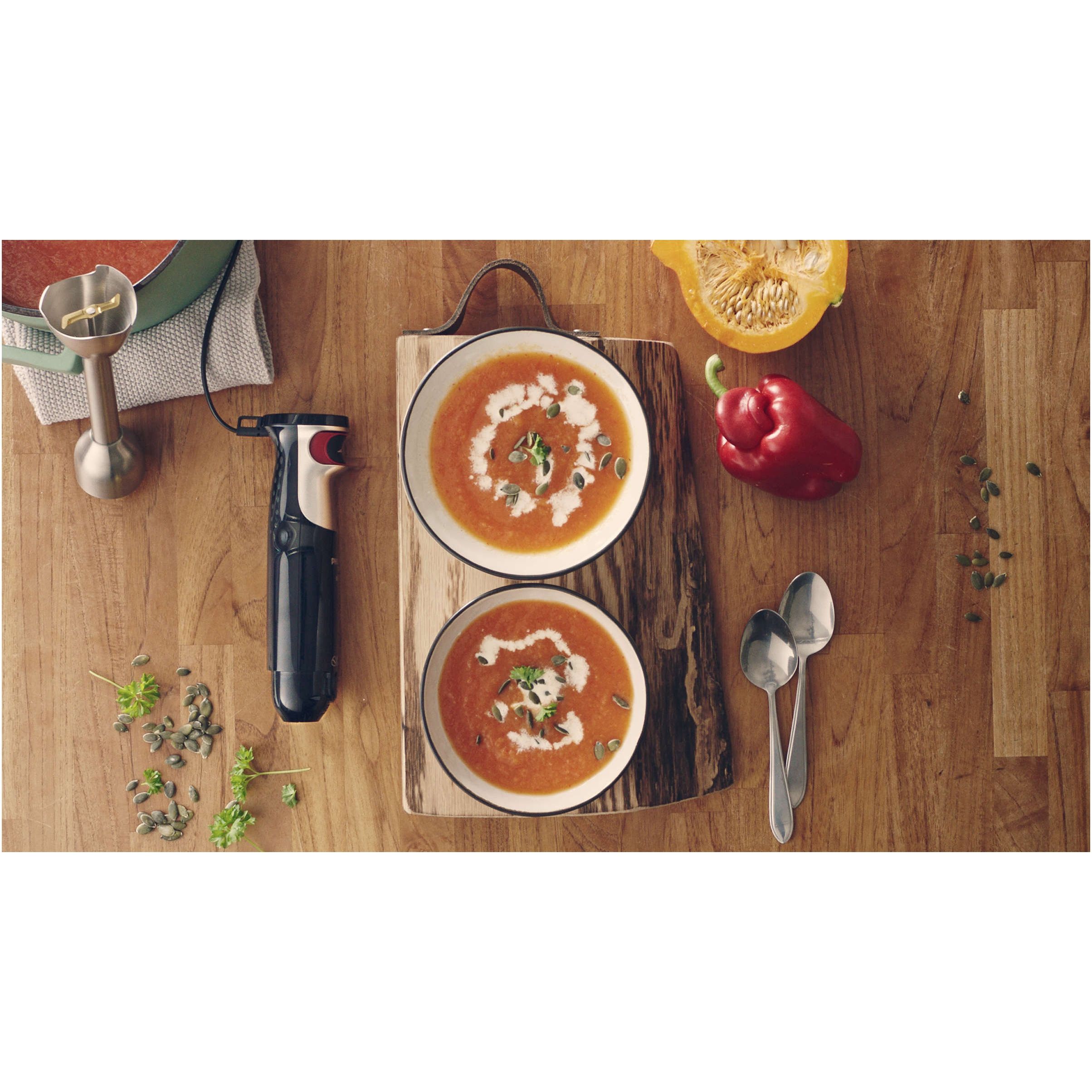 Bol ProMix 1 l pentru amestecare, batere şi combinare optime. Un bol triunghiular de 1 l este livrat împreună cu mixerul vertical. Bolul mixerului este prevăzut cu o scurgere ergonomică şi cu măsuri. Forma unică triunghiulară a bolului oferă posibilitatea de a fi uşor de ţinut în mână şi creează un vârtej care trage ingredientele către fundul bolului unde este grilajul barei pentru blender ProMix, pentru amestecare, batere şi combinare optime.