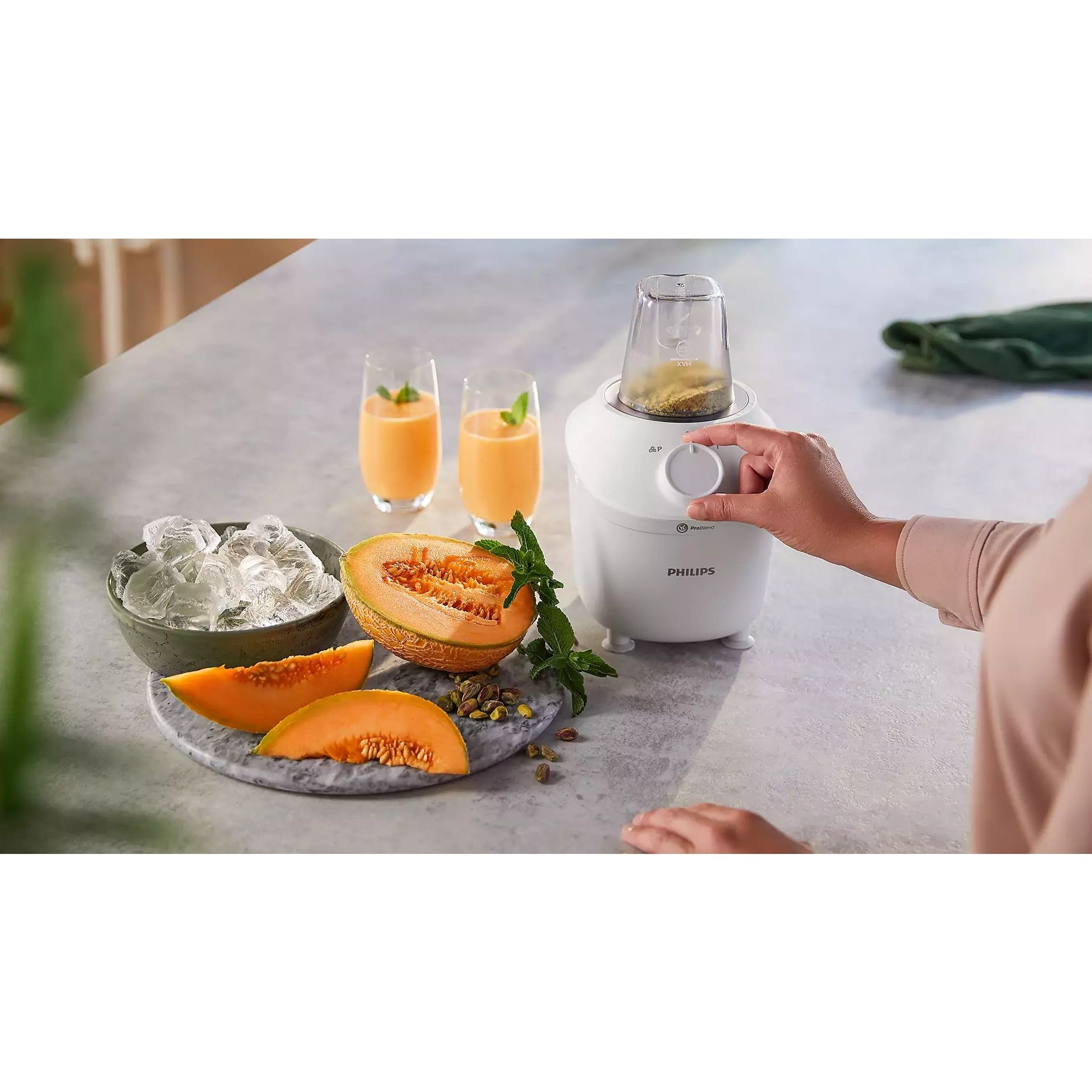 Produce o gamă largă de băuturi și permite prepararea rapidă a ingredientelor pentru mesele preferate, cu 1 setări de viteză și Pulse din care poţi alege. Folosește pentru ingrediente de la ierburi, condimente și legume, la măcinarea cafelei și chiar zdrobirea gheţii pentru a prepara un smoothie delicios răcit.