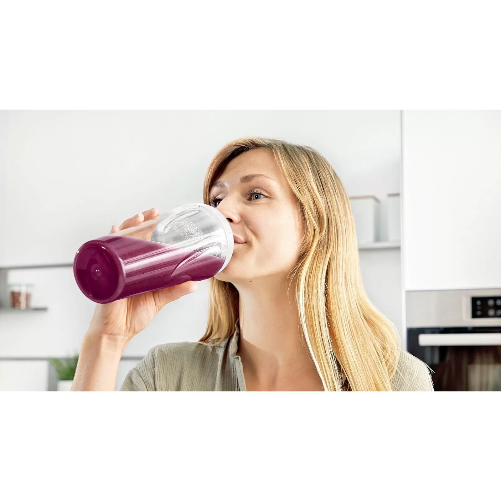 Bucură-te de calitate superioară și de o durată lungă de funcționare datorită celor peste 100 de ore de testare echivalente cu prepararea a 10.000 de căni de smoothie. Performanța constantă este asigurată de materialele de calitate superioară, de producția in Europa și de îndelungata expertiză Bosch, pasează direct în sticla ToGo cu protecție antiscurgere și ia smoothie-ul cu tine oriunde mergi.