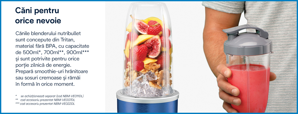 Cănile blenderului nutribullet Pro sunt concepute din Tritan, material fără BPA, cu capacitate de 700ml/ 900ml şi sunt potrivite pentru orice porție zilnică de energie. Prepară smoothie-uri hrănitoare sau sosuri cremoase şi rămâi în formă în orice moment.