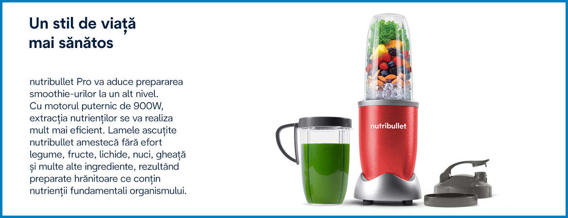Putere de extractie mai mare pentru rezultate gustoase. nutribullet Pro va aduce prepararea smoothie-urilor la un alt nivel. Cu motorul puternic de 900W, extracția nutrienților se va realiza mult mai eficient. Lamele ascuțite nutribullet amestecă fără efort legume, fructe, lichide, nuci, gheață și multe alte ingrediente, rezultând preparate hrănitoare ce conțin nutrienții fundamentali organismului. nutribullet Pro este conceput pentru o varietate largă de preparate delicioase. Preparați sosuri cremoase, smoothie-uri răcoritoare, piureuri delicioase si cocktailuri festive, cu ajutorul unui singur blender. Compact și modern, nutribullet Pro conturează un gust deosebit pentru orice tip de preparat, in funcție de fiecare preferință. Designul unic face ca blenderul să fie potrivit tuturor bucătăriilor, ocupand foarte putin spațiu. nutribullet Pro amestecă si marunțește orice aliment, indiferent de textura acestuia. Versatilitatea blenderului este evidențiată de cele 2 cupe cu cantități diferite si 3 accesorii ușor de utilizat.