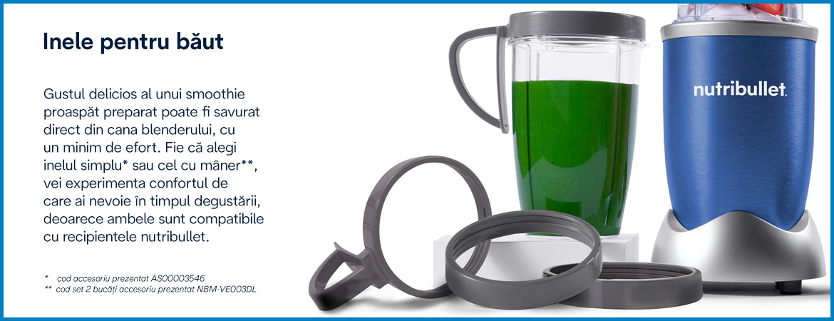 Gustul delicios al unui smoothie proaspăt preparat poate fi savurat direct din cupa blenderului, cu un minim de efort. Fie că alegi inelul simplu sau cel cu mâner, vei experimenta confortul de care ai nevoie în timpul degustării, deoarece ambele sunt compatibile cu recipientele nutribullet.