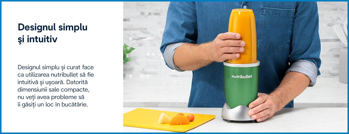 Designul simplu și curat face ca utilizarea nutribullet să fie intuitivă și ușoară. Datorită dimensiunii sale compacte, nu veți avea probleme să îi găsiți un loc în bucătărie.