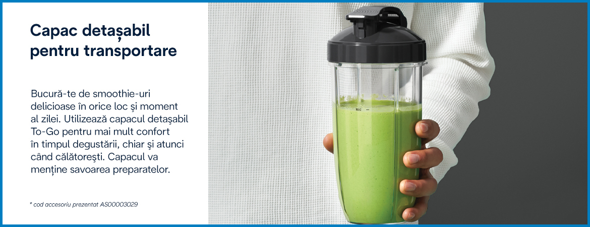 Bucură-te de smoothie-uri delicioase în orice loc și moment al zilei. Utilizează capacul detașabil To-Go pentru mai mult confort în timpul degustării, chiar și atunci cand călătorești. Capacul va menține savoarea preparatelor.