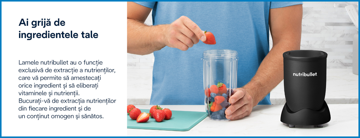 Designul simplu și curat face ca utilizarea nutribullet să fie intuitivă și ușoară. Datorită dimensiunii sale compacte, nu veți avea probleme să îi găsiți un loc în bucătărie.