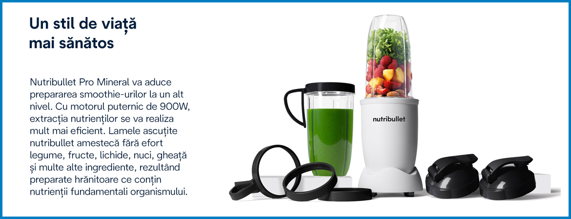 Motorul puternic de 900W al blenderului nutribullet Pro Mineral transformă orice aliment, de la fructe si legume pana la ingrediente cu textura mai dură, precum nucile sau alunele, într-un amestec omogen şi delicios.