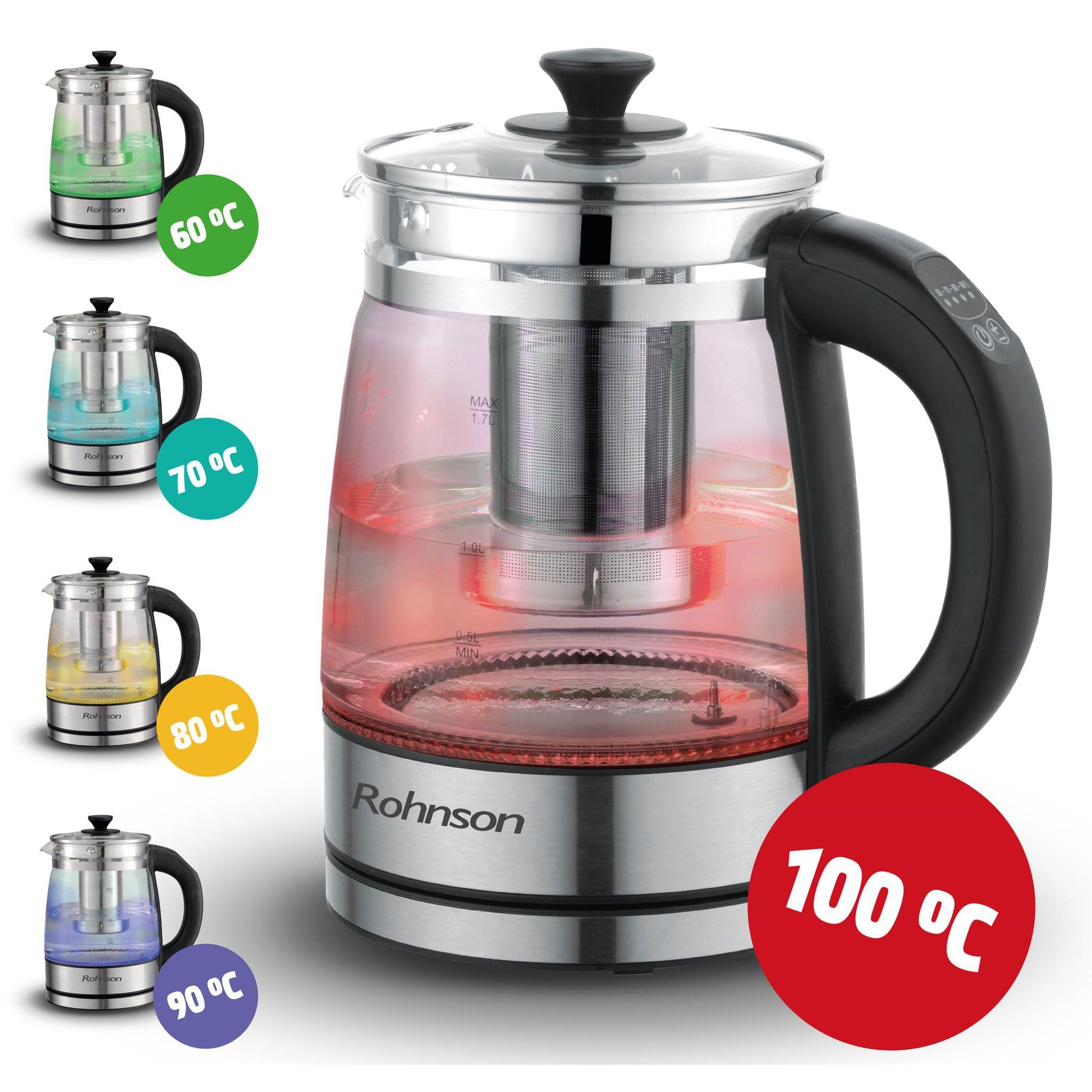 Fierbător Rohnson R7610, Putere 2200W, Capacitate 1.7l, Filtru pentru ceai, Bază rotativă, Iluminare LED la temperaturi diferite