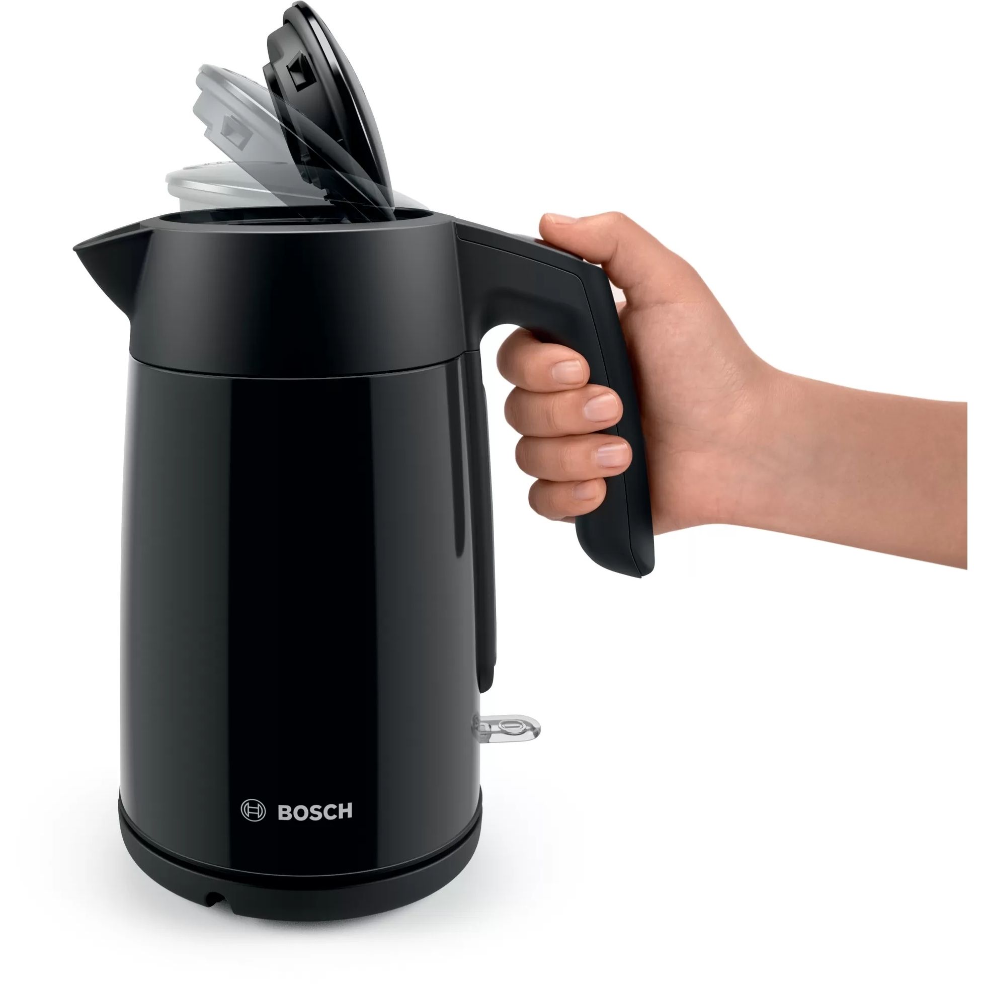 Umplerea fierbătorului cu apă trebuie să fie cât mai confortabilă posibil. Capacul acestui fierbător poate fi deschis prin atingerea unui buton.