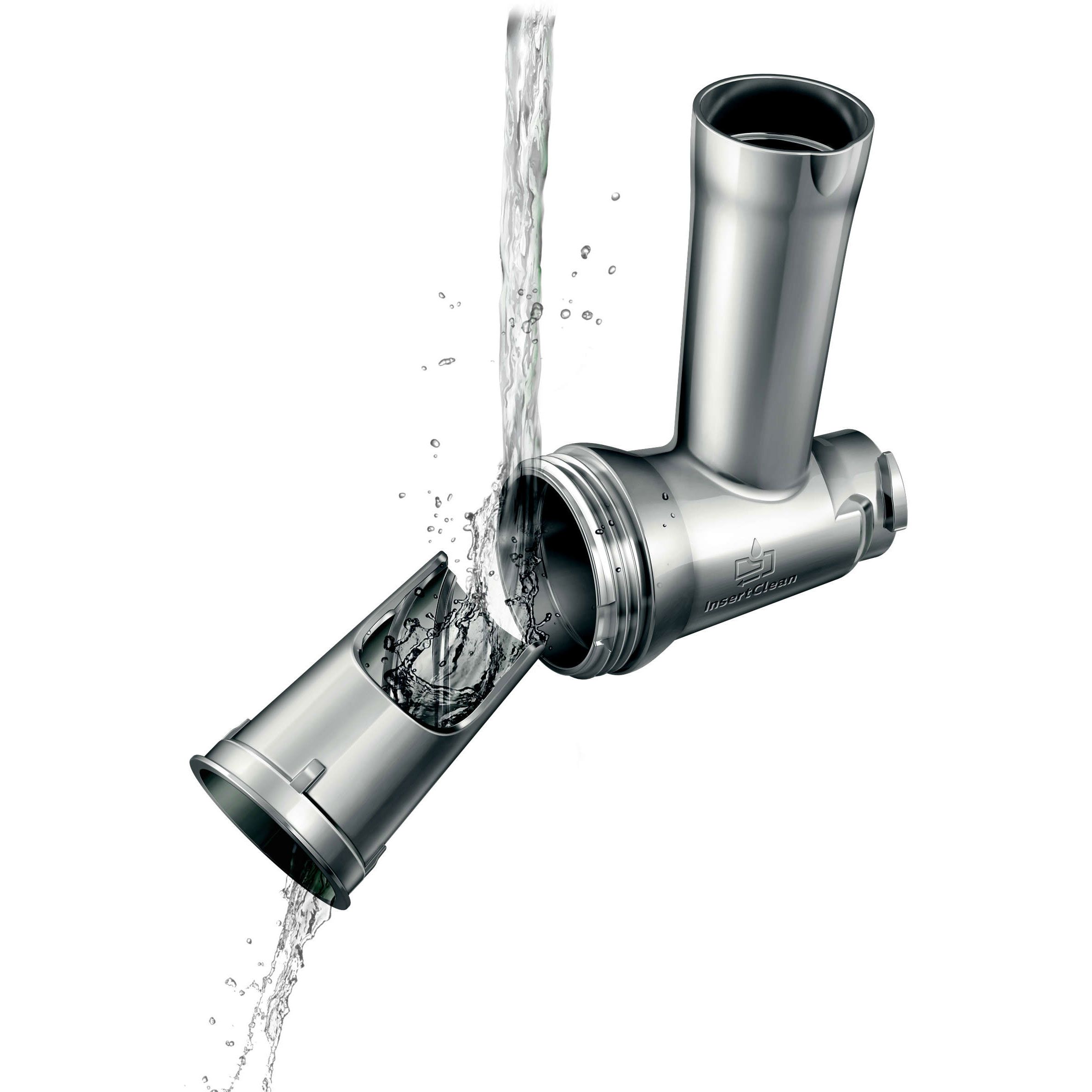 Accesoriu pentru curăţare inovator, cu 2 laturi. Accesoriul pentru curăţare inovator, cu 2 laturi reduce cu 50% timpul de curăţare. După tocare, fixează pur şi simplu ecranul de tocare pe dispozitivul de curăţare şi clăteşte sub jet de apă. Fără curăţări anevoioase şi orificiile înfundate ale ecranului!