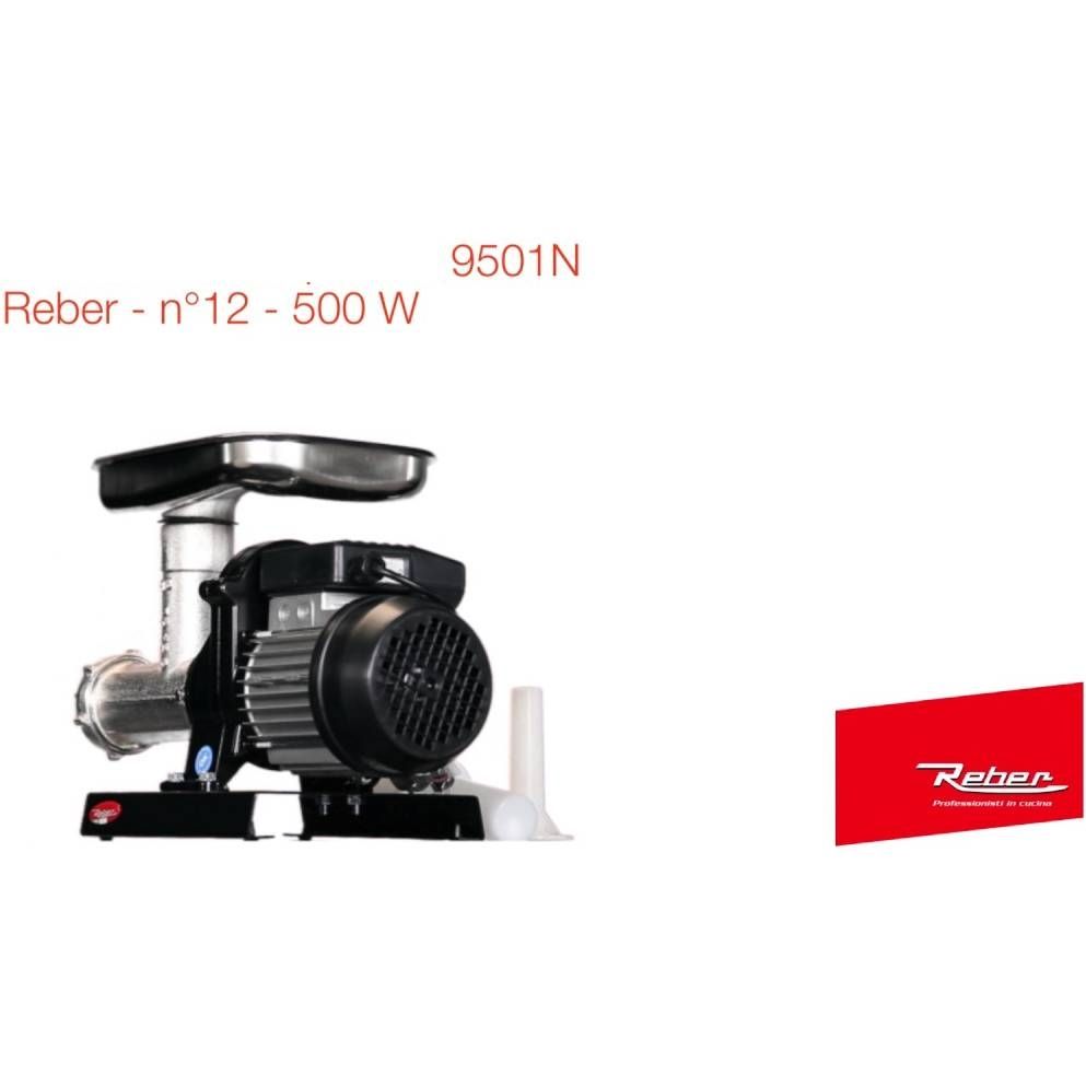 Mașina electrică de tocat carne Reber 9501 N este echipată cu un motor de 500W. Capacitatea de tocare este de 50-90 kg/h. Motor electric cu inducție continuă. Ventilator de răcire, capac ventilator și cutie de comutator-condensator etanșă la apă, din material plastic. Clasă de protecție IPX5. Unitate de reducere axială cu roți dințate metalice în baie de ulei. Corp, elice și inel din fontă pentru uz alimentar. Toate tocătoarele de carne Reber pot fi echipate cu un storcător de roșii (pentru sos de roșii și gemuri) sau o răzătoare (pentru râșnirea pâinii și a brânzei) pe același motor.